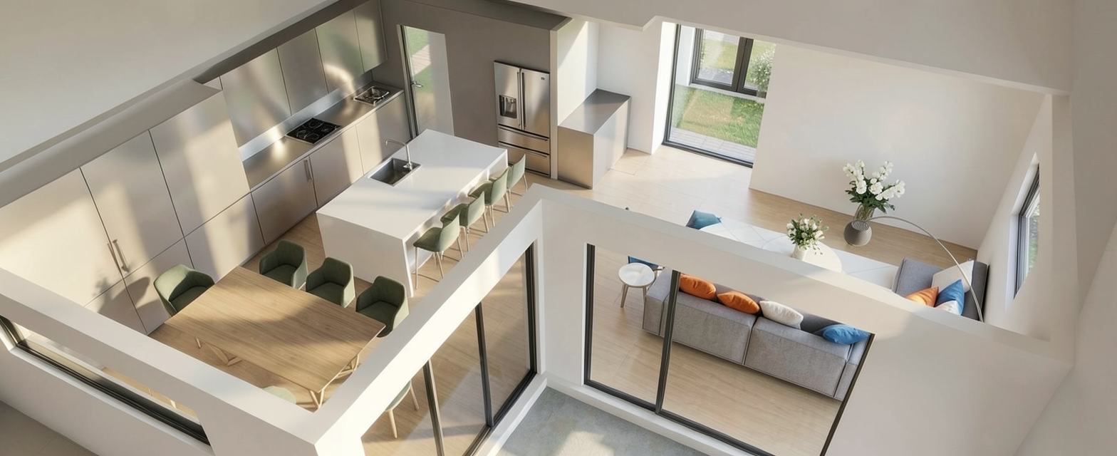 modernist interior shot cleanup the garbage keep the layout and add furniture in bauhaus style this is an intermediary shot of a open space living room overseeing the doors architecture