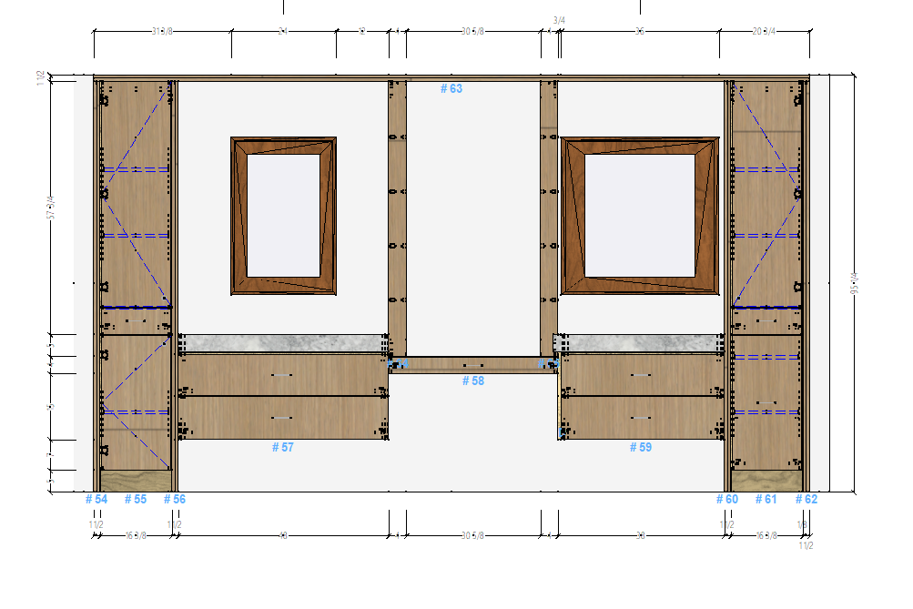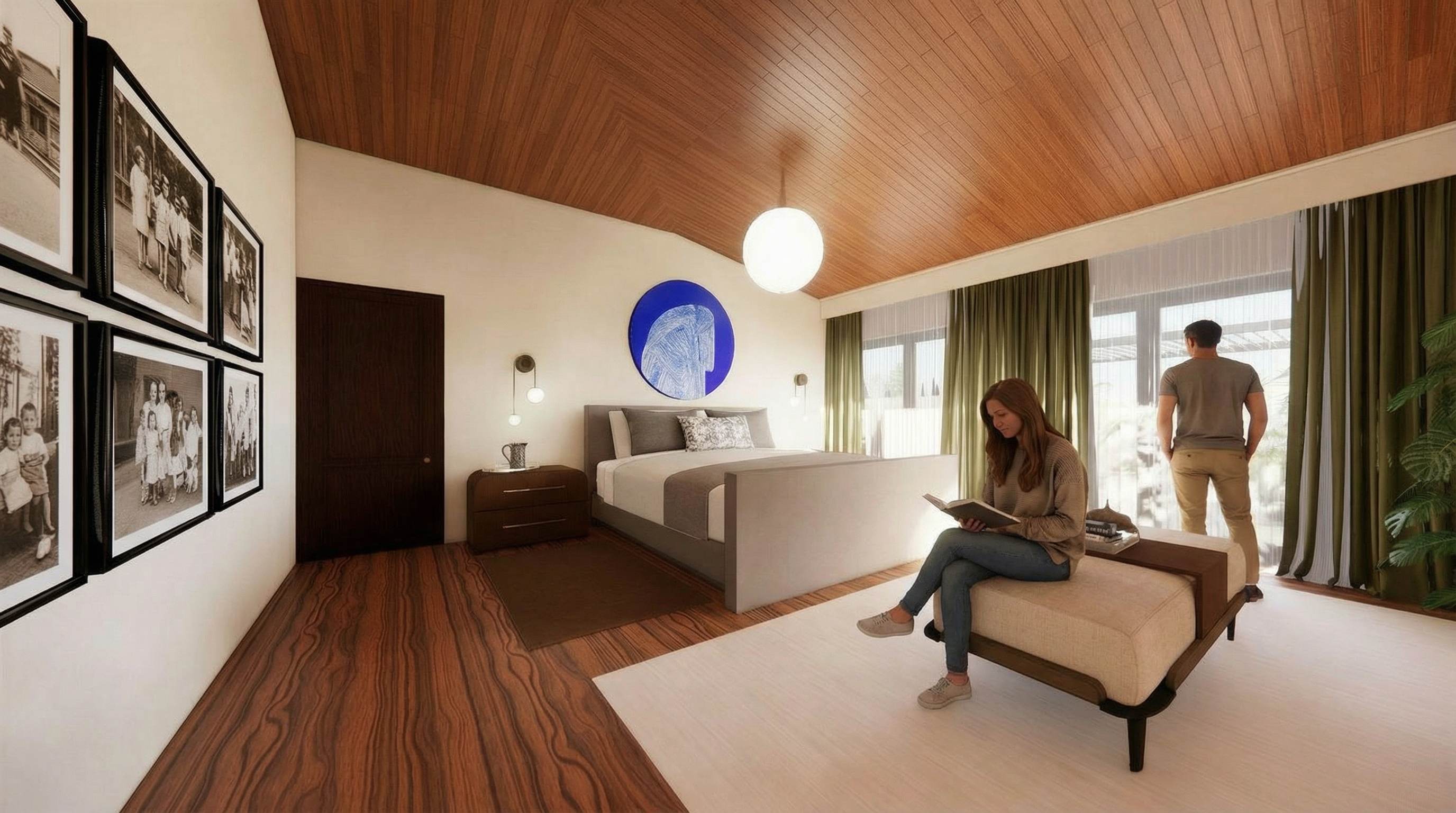 create a warm primary bathroom with medium ton wood large rectangular white floor tiles and modern lighting