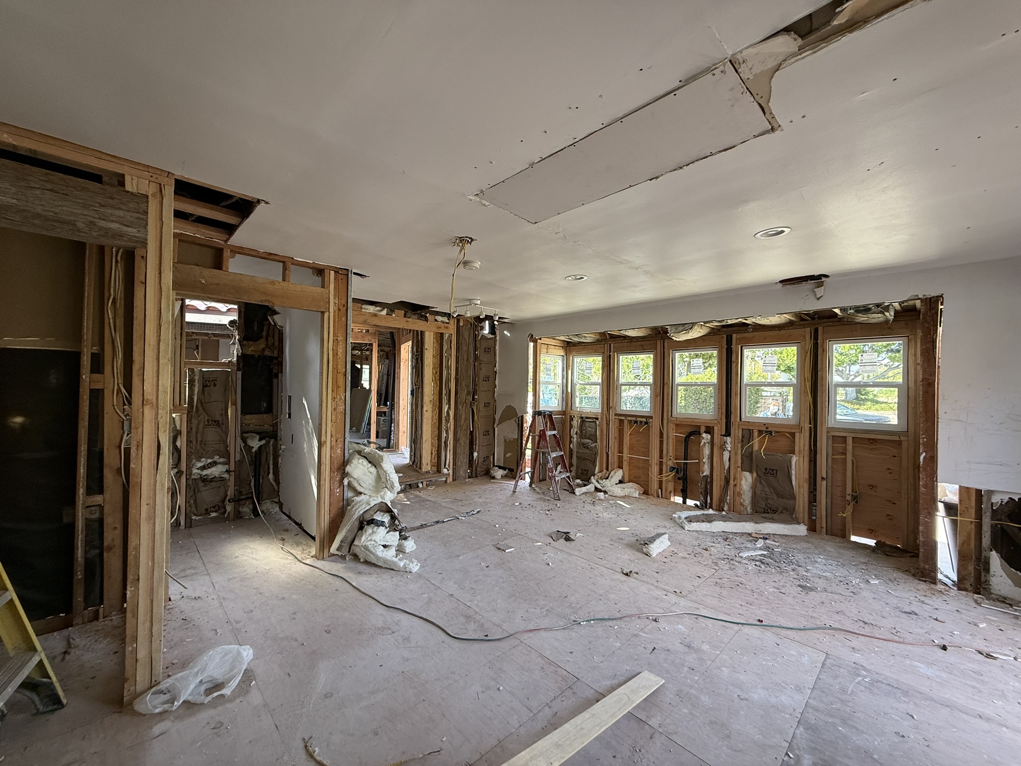 interior shot add drywall to remaining framing and add base kitchen cabinets under bank of windows in a white oak finish
