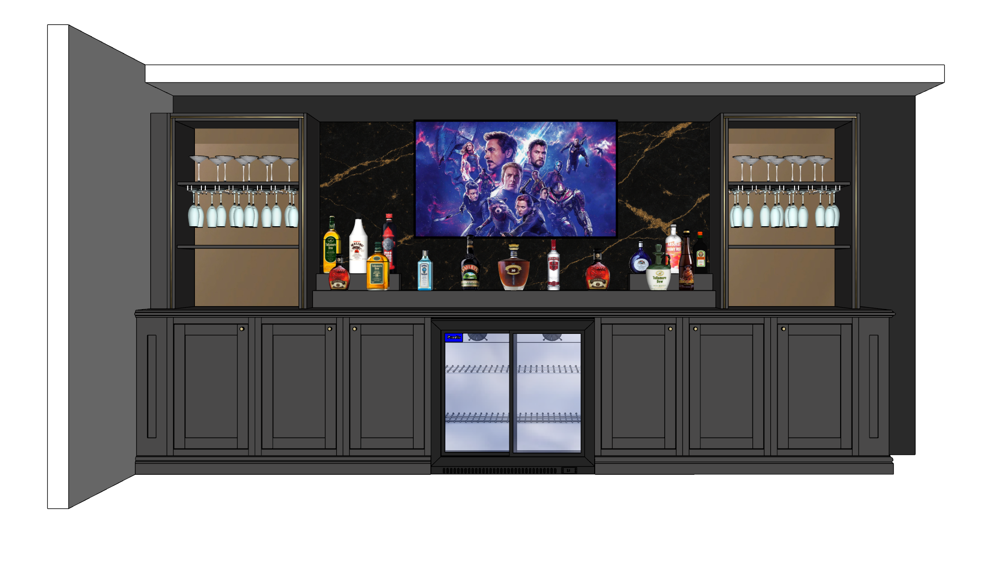 interior shot keep all colours true to what they are in the image take note of the brass trims and bronze mirrors in the back of the upper outer cabinets