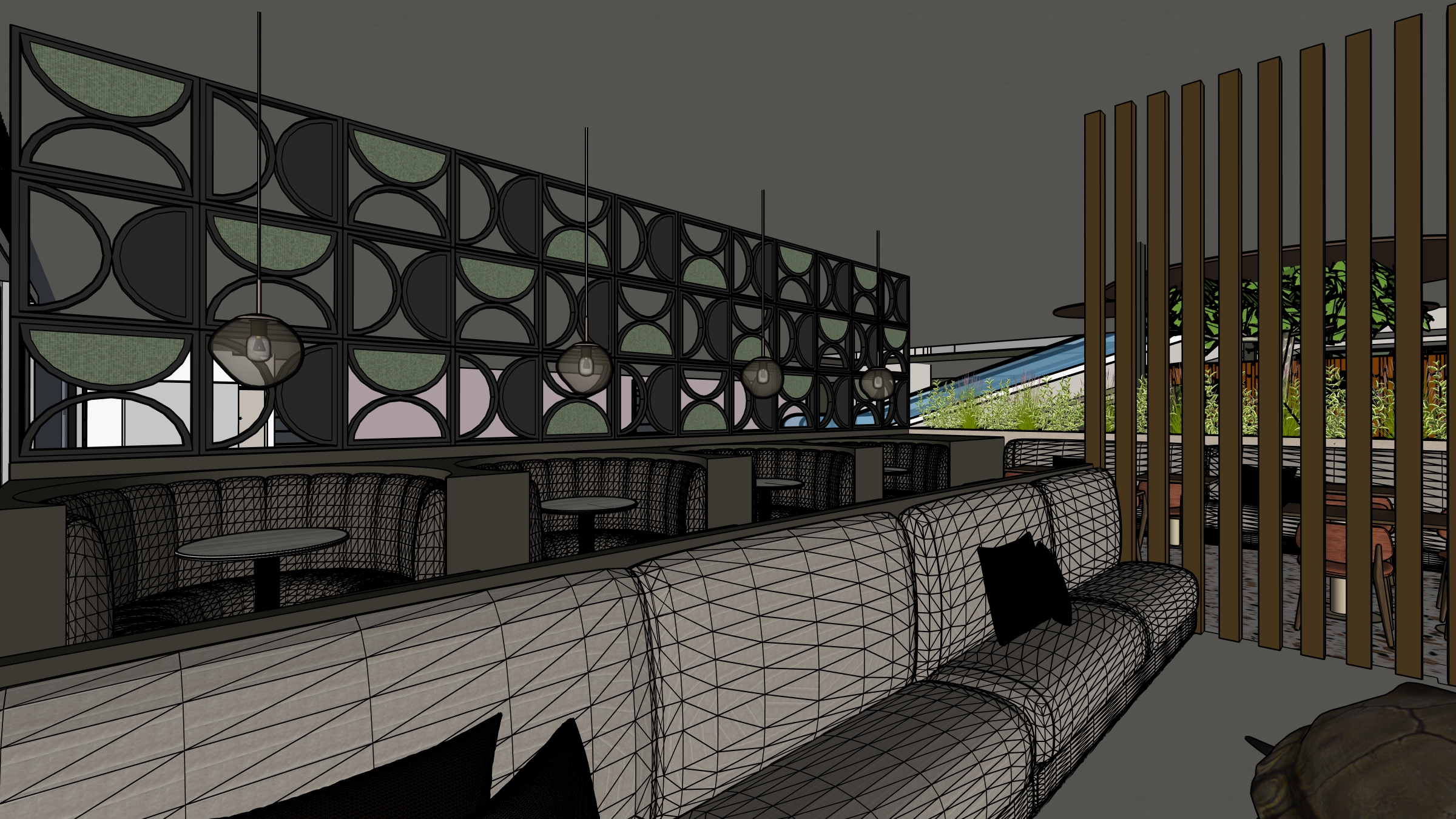 a photorealistic 8k high resolution interior photograph of a modern multi functional atrium and cafe space looking straight down the central axis from an eye level perspective based strictly on the provided composition in image 1 png the scene is illuminated by sophisticated layered architectural lighting that creates complex shadows and highlights emphasizing the textures there are absolutely no changes allowed to the design or proportions of the original image flooring the foreground features a detailed patterned terrazzo surface with black white brown and pink stone fragments embedded in a pale creamy matrix the surrounding floor areas are a smooth polished concrete in a subtle gray beige tone columns and structure the central and right side vertical columns are finished in a smooth matte coat of complex dark charcoal green paint comparable to little greene attic 2 the left side vertical element features a photo realistic vertical lowercase text inscription that reads welkom in white with a stylized pink and magenta logo positioned directly above it all on the same dark charcoal green background all structural columns are also finished in this dark charcoal green pergola poles and hanging fixture suspension rods feature a warm bronze finish room divider the prominent curved room divider wall on the right is constructed of black wood with an intricate geometric pattern filled with rich green felt furniture and seating zones curved booths right a series of curved booths are upholstered in a highly textured complex dark liquorice colored fabric verotex tobago saba 05 liquorice rounded chairs with armrests walnut wood frame with a coarse tactile grey beige woven fabric comparable to fabb bjornn 77 straight benches right midground benches are upholstered in distressed aged light grey vintage leather dux vintage fr light grey with a refined patina armless chairs far background near table walnut wood with a smooth neutral taupe wool felt fabric canyon 0967 0025 taupe surrounding a walnut topped table on a warm beige round pedestal central feature and circular booths background custom furniture base surrounding the central tree is finished in a soft warm taupe grey beige paint finish comparable to little greene ganache 345 kitchen service counter area far background counter body with linear textured pale wood grain laminate comparable to decolegno reflex fd06 with dark charcoal green edges countertop in smooth polished white quartz with soft grey veining comparable to quartzform veined deco 915 linear bronze slat details highly textured back wall comparable to vescom tonga 1082 12 lighting three large intricate handwoven natural colored rattan pendant lamps are suspended over the central background feature by dark bronze rods the overall space is bathed in warm integrated architectural lighting walls and ceilings main walls and ceiling textured gray concrete stucco floating ceiling discs over background area ganache colored vilt plants a large mature multi trunk ficus tree with large vibrant green leaves is the central focus in the background area tall feathery grasses fill the far background planter refinement focus on photorealistic details texture definition for all materials felt woven leather vilt concrete rattan accurate light behavior and realistic reflections maintain the exact spatial arrangement strict directive render the scene exactly as shown preserving all proportions and design elements but with photorealistic materiality and lighting do not add or subtract elements