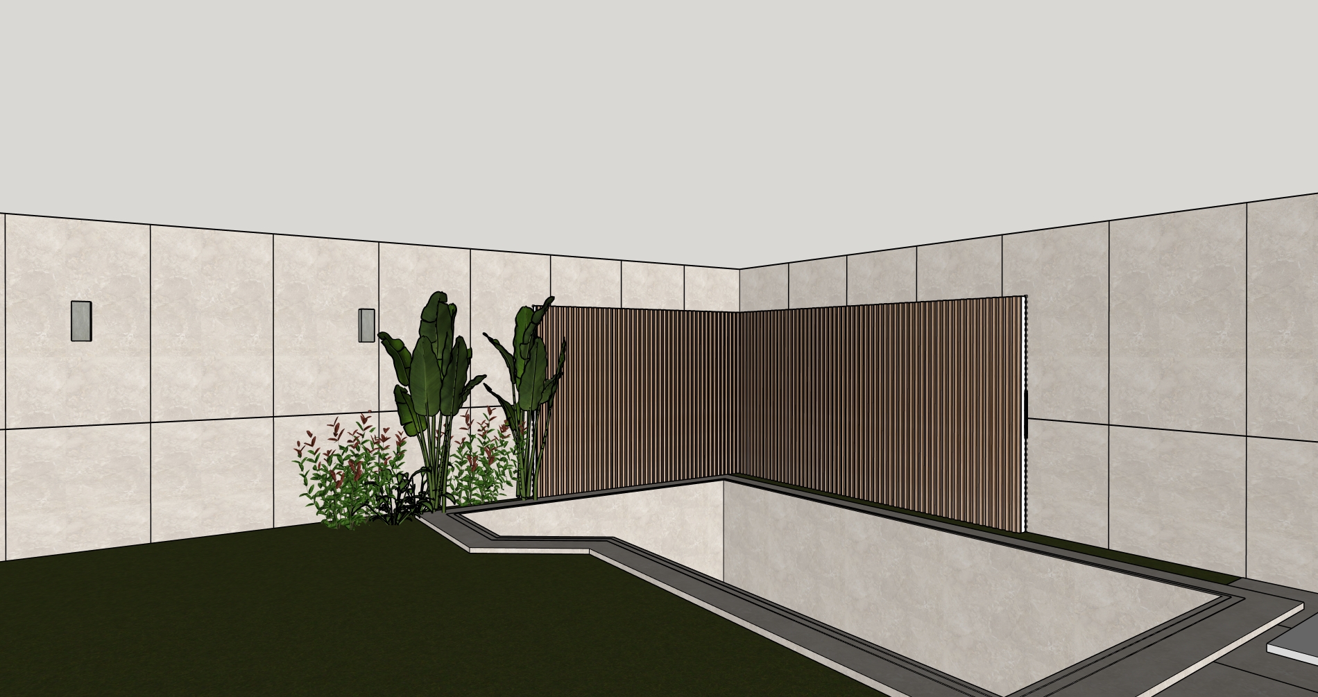 crea una imagen fotorealista a partir de este sketchup es un exterior tenlo en cuenta a ade agua para el hueco de la piscina el cesped mas corto casi al ras y que no se vea tanto la union entre las baldosas de la pared