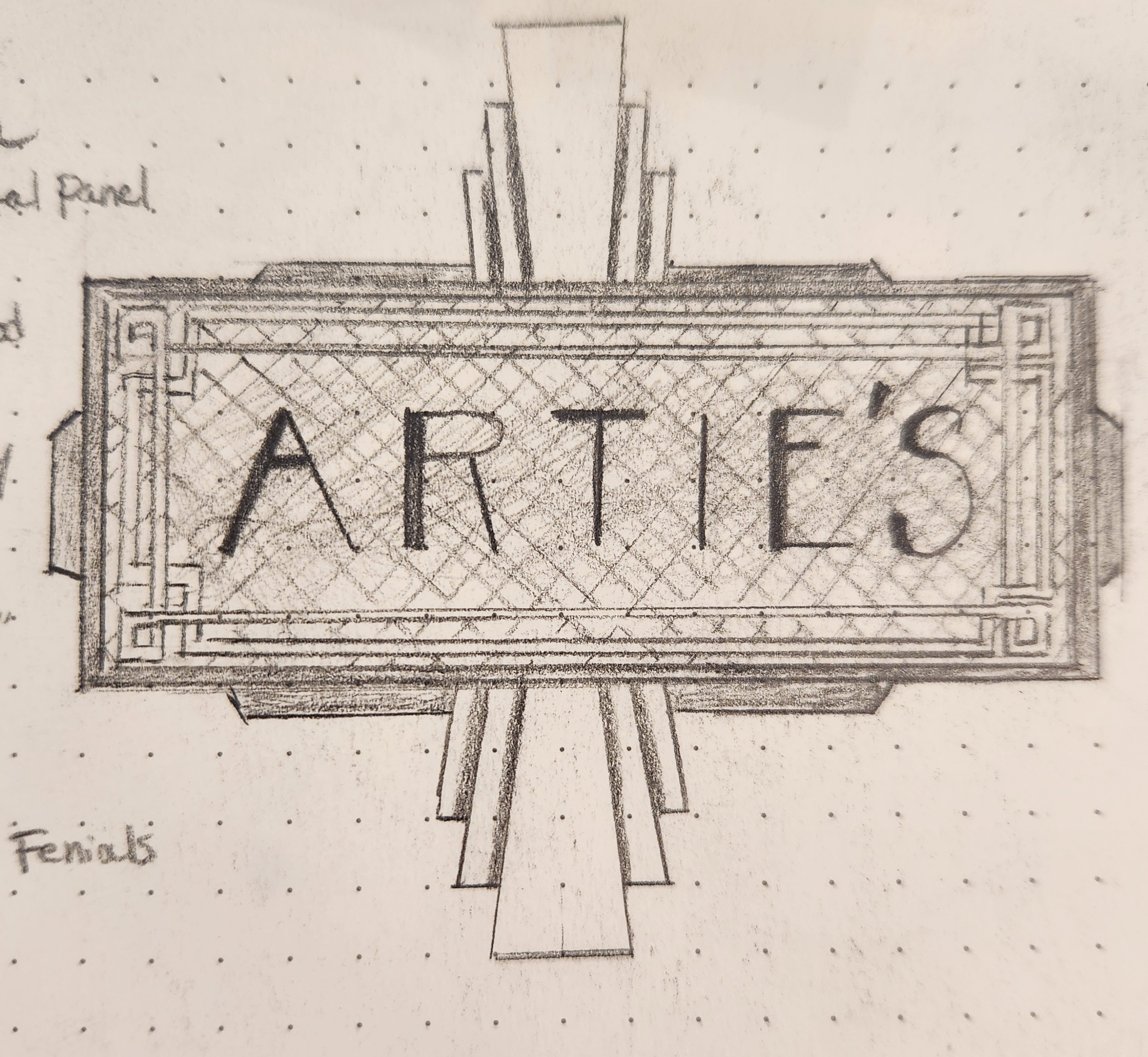 render a classy bar sign with art deco design the outer frame is a deep glossy mahogany the frame encases an illuminated glass panel with writing on it the panel has a brass wire mesh over it metallic accents protrude above and below the frame the sign sits on a navy blue wall in a classy lounge
