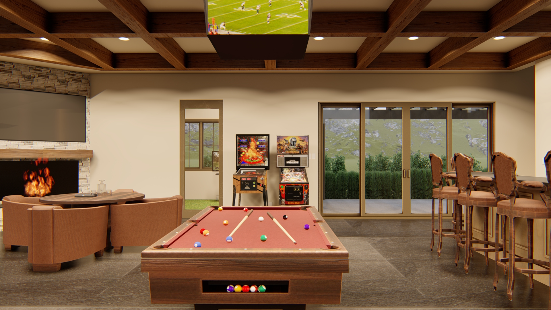 behind the pool table there s two fliperamas make the leather brown