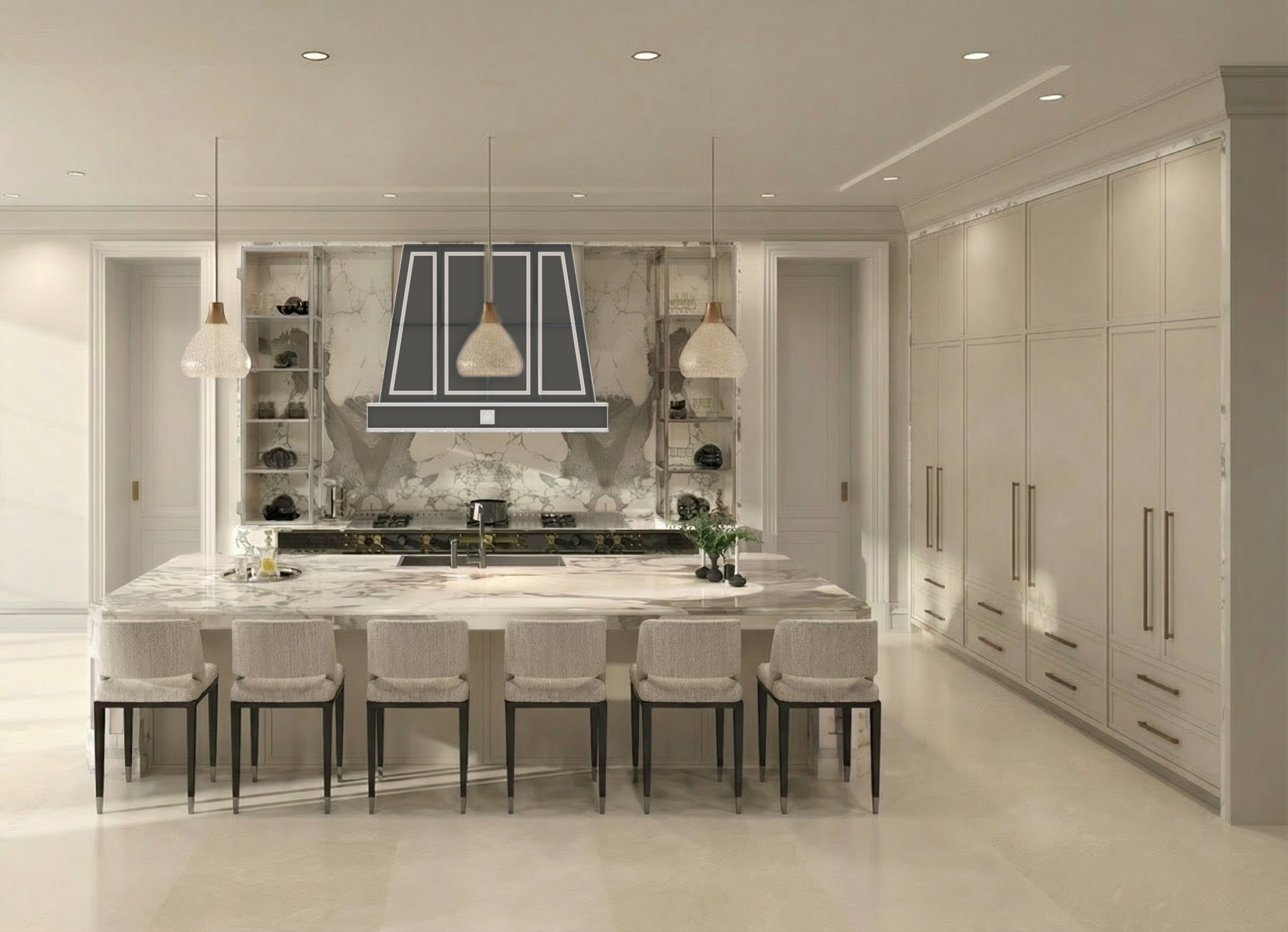 edit only the kitchen hood match the hood s main surface material and color exactly to the light wood tone and finish used on the underside of the kitchen island replicate the same wood species grain direction warmth and level of sheen for a cohesive built in millwork appearance the metallic lines details on the hood should be brushed nickel with subtle directional grain and realistic metal reflectivity ensure the hood interacts naturally with existing lighting and shadows do not modify anything else in the image