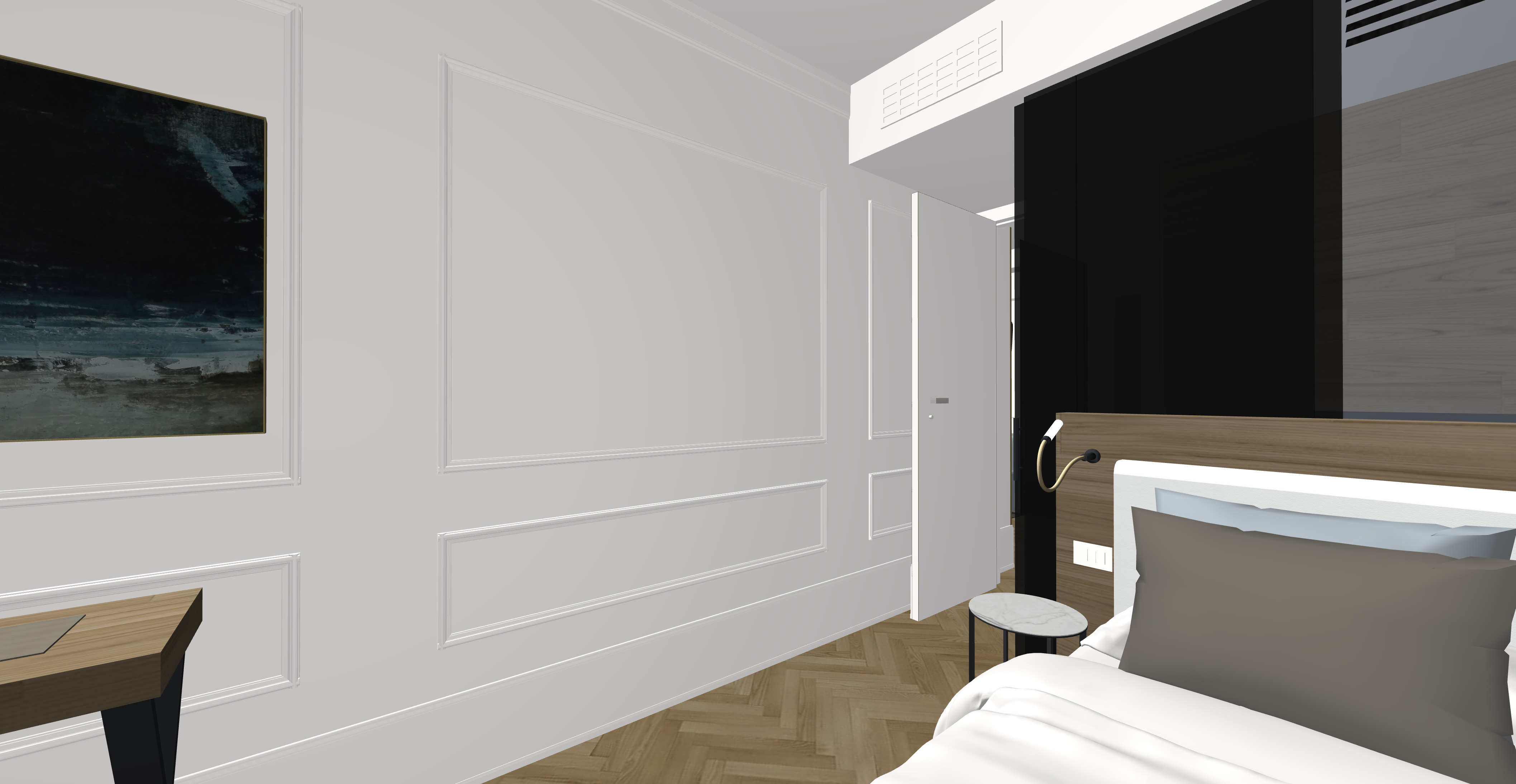 la parete nera vetro nero pareti e soffitto sono tinteggiate bianche la testata letto in legno rovere naturale chiaro accendi punta luce da lettura