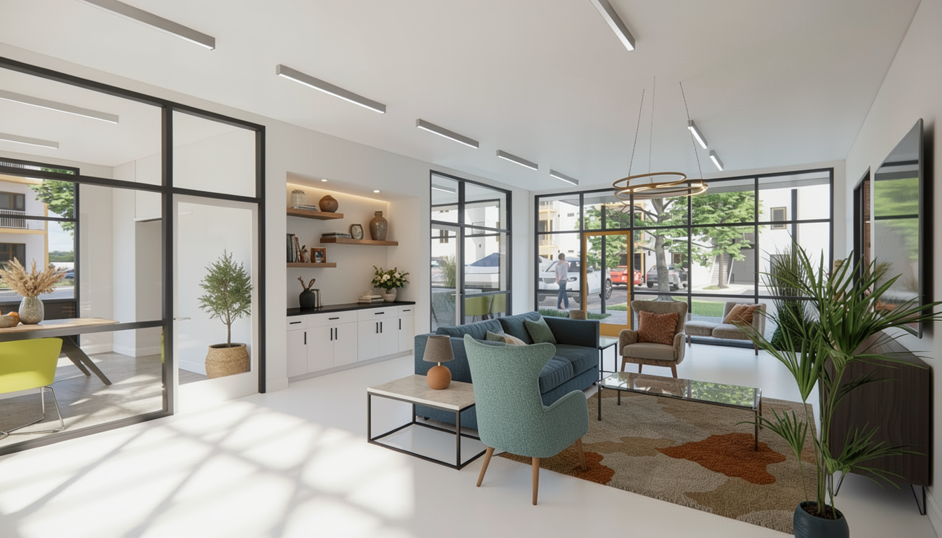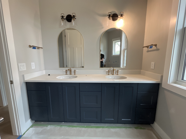 do not change the cabinets in any way preserve the exact cabinet colors materials finishes dimensions door and drawer styles hardware spacing alignment and all geometry exactly as shown do not alter the countertop shape backsplash appliances flooring lighting fixtures or wall structure only remove the construction materials clutter and mess from the scene clean the room and make it look finished and staged add a few simple tasteful home accessories appropriate for the style of the space but do not add or remove any furniture windows or architectural elements maintain the original lighting direction and realism enhance clarity and polish the photo while keeping the cabinetry and room design completely unchanged do not alter the lighting to keep the cabinet colors as they are in the image add tile flooring towels to the rods on the walls and stage for a bathroom