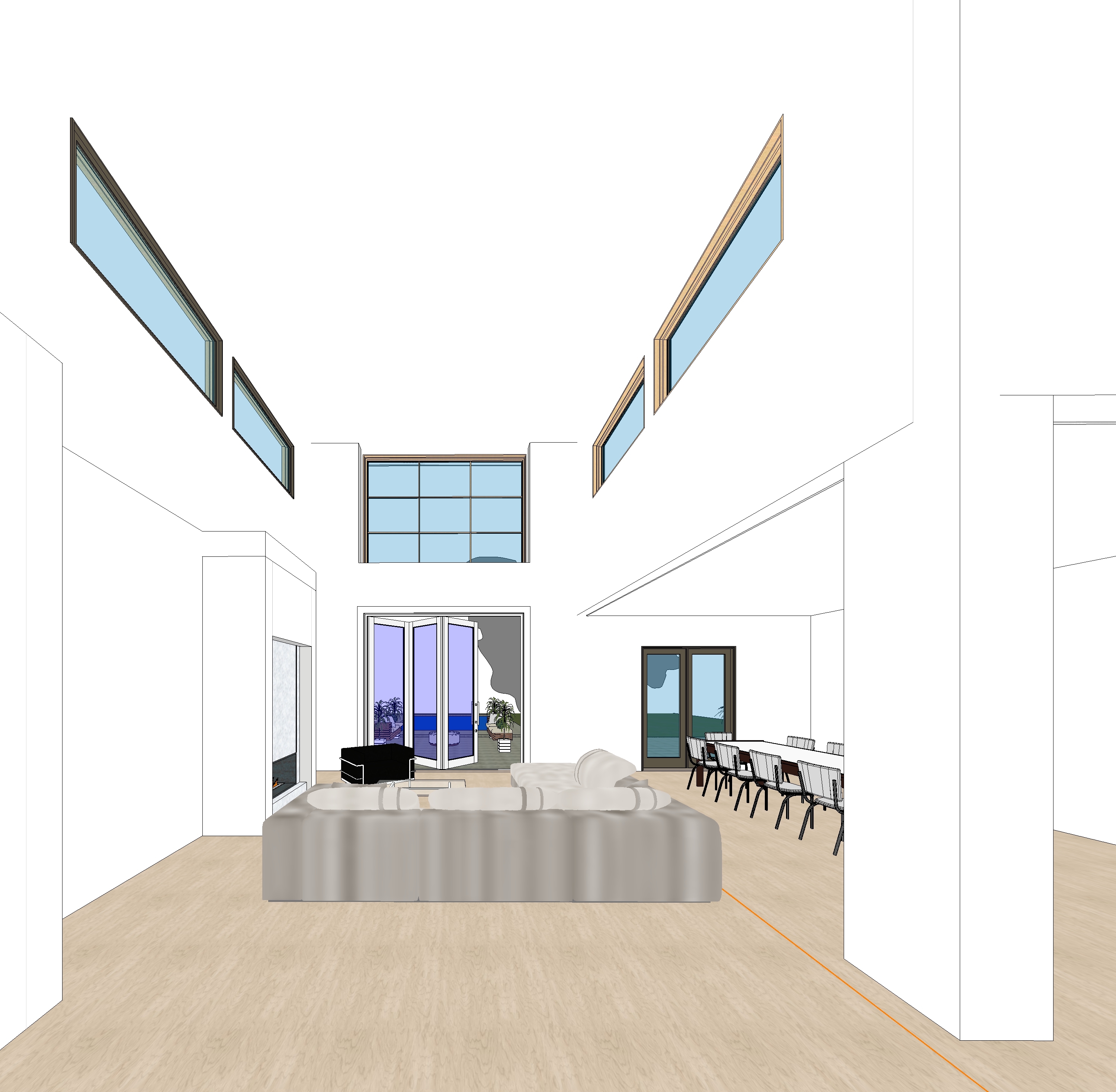 white interior walls black window and door frames wood flooring fireplace on the left side chandelier from ceiling in the middle fireplace black stone wall