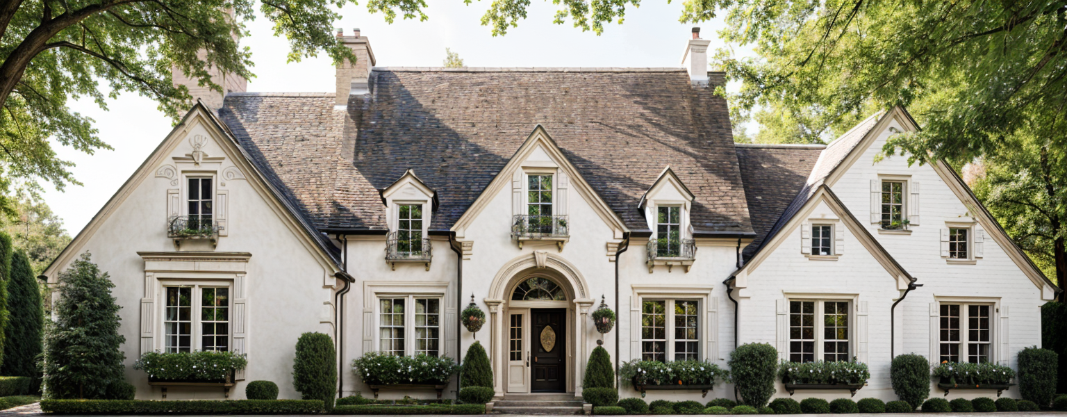 colonial revival exterior shot canexel walnut horizontal siding stone base lush green lawn surrounding a curved driveway boreal forest background architecture