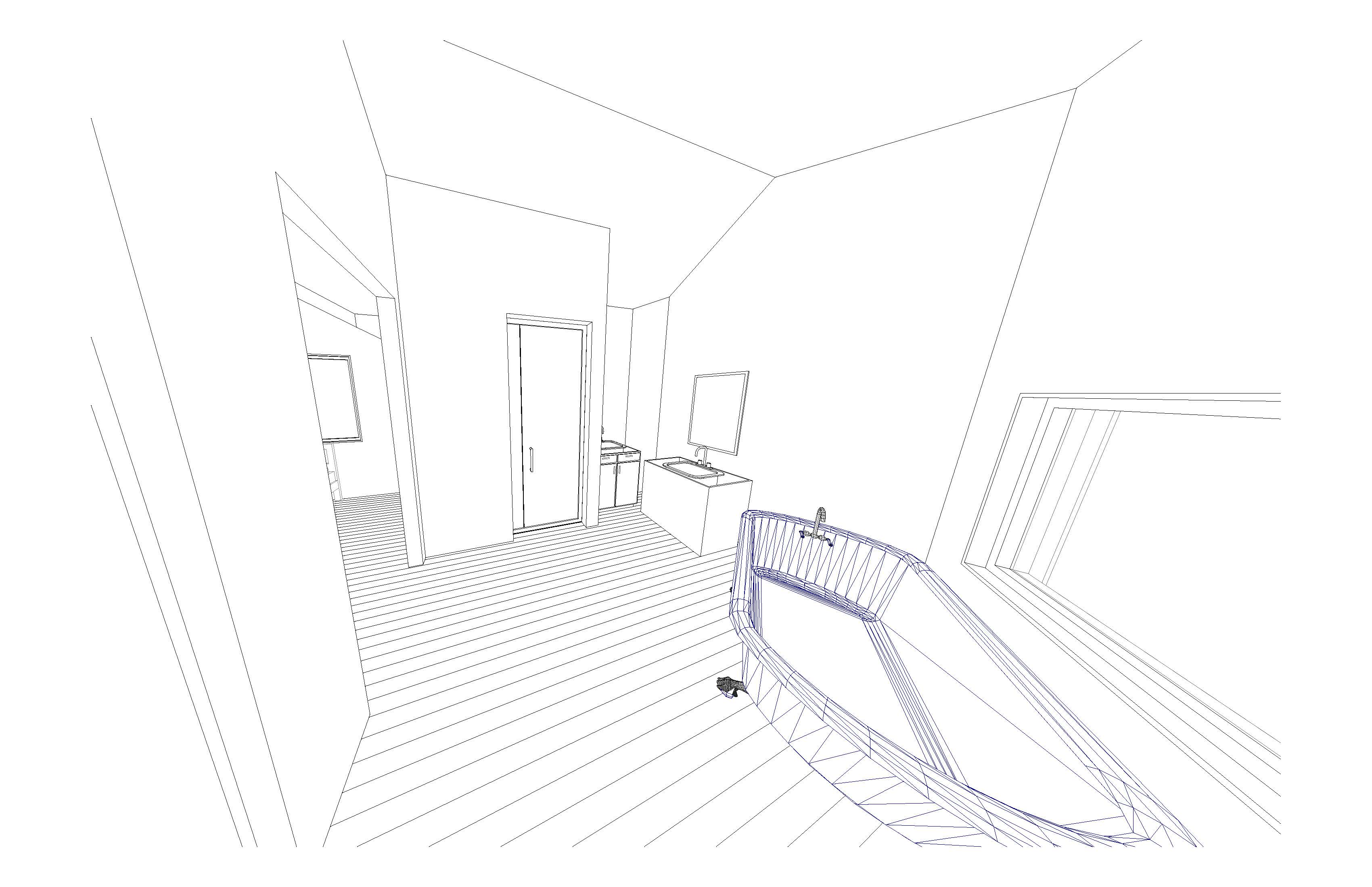 modern bathroom copper standing tub next to window bottom right left is a shower with bench fix cabinetry and shelving keep original angle and placement of things