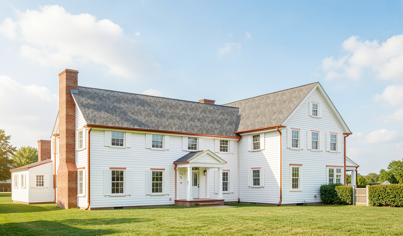 horizontal white siding white trim lead gutters