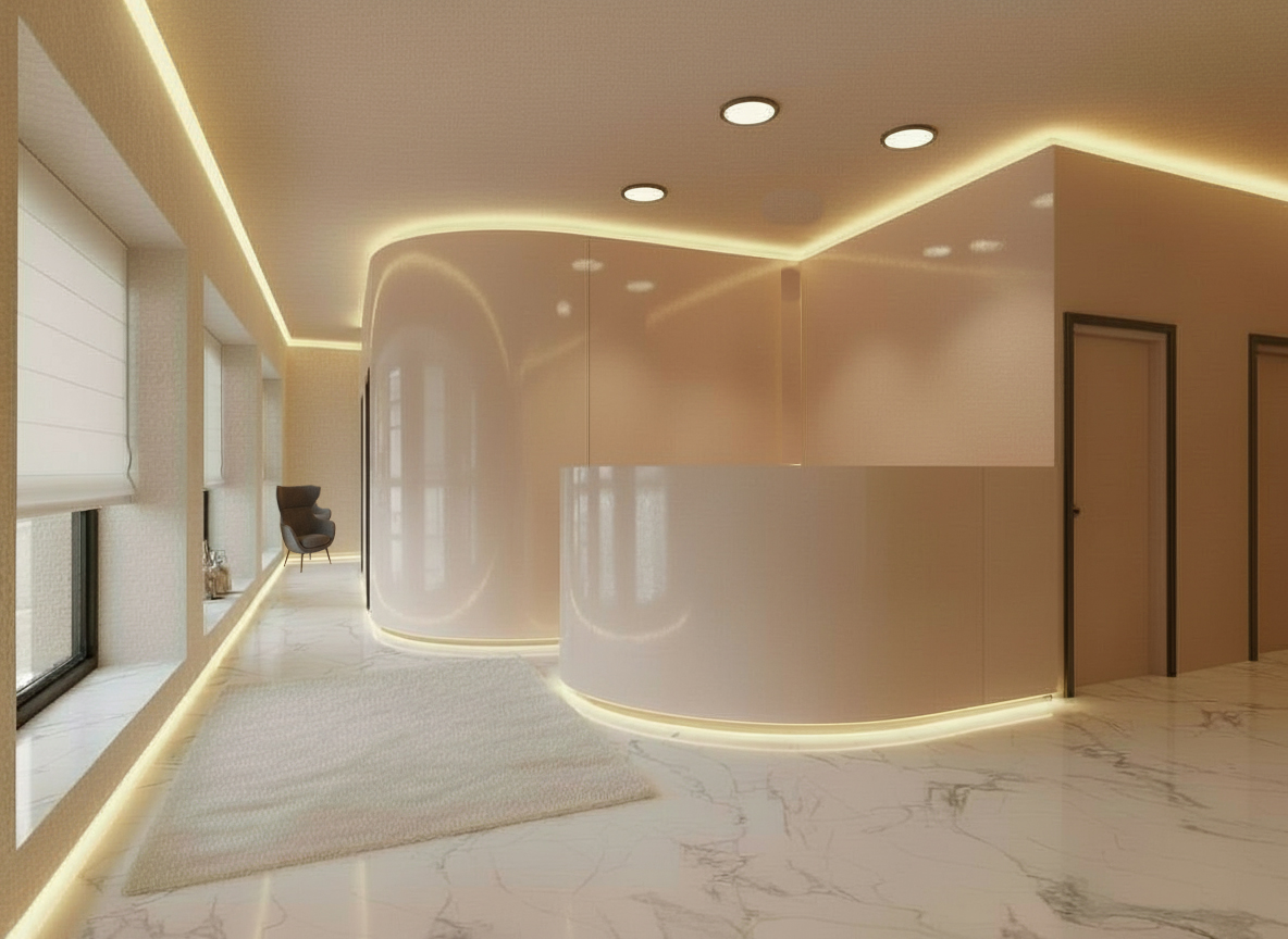 change glossy clay to semiglossy light up reception desk area put in 2 rolf benz armchairs with coffee table to left bottom corner do not change geometry