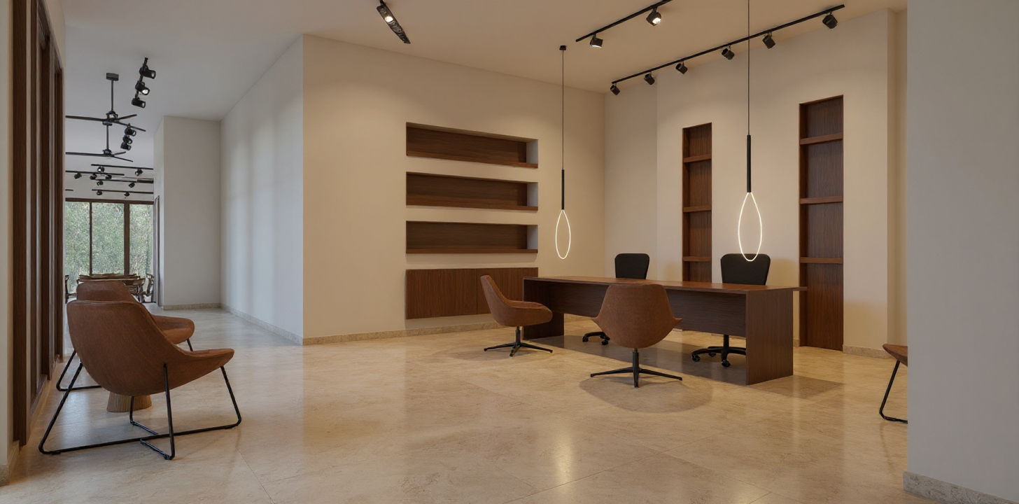 full quality lights on 300k floor travertine matte dark wood paint walls off white