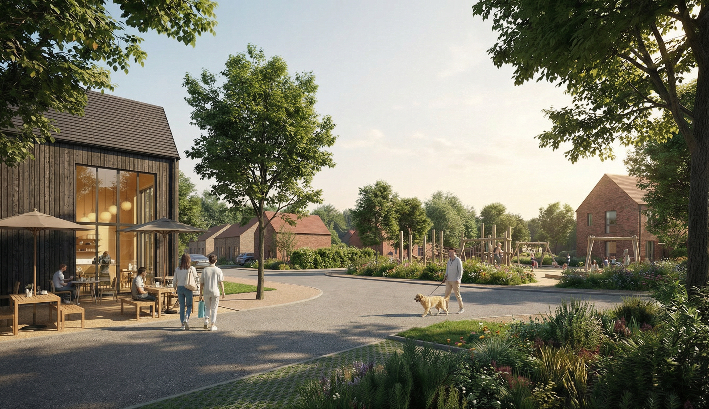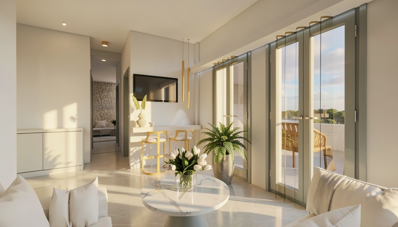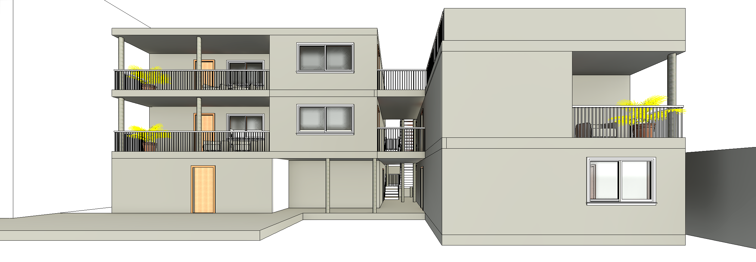 new building in a residential california neighbourgh with grass and plants polished concrete build is beige warm tones at gonden hour with soft shadows