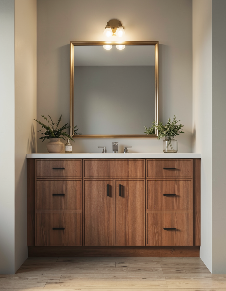 transform the provided elevation into a hyper realistic interior photograph that is indistinguishable from a real professionally shot interior design photograph this must read as a real space captured by a camera not a rendering not a visualization not architectural cg not concept art and not an illustration geometry lock non negotiable preserve the exact original geometry layout proportions ceiling details wall depths panel divisions openings doors cabinetry locations millwork dimensions built ins and circulation paths with zero architectural changes nothing may move scale simplify or be reinterpreted geometry must remain absolutely unchanged camera derivation critical derive the camera position height angle and framing strictly from the uploaded elevation eye level interior photography centered or naturally balanced composition 24 35mm interior lens feel no dramatic angles no stylized framing do not reuse or approximate camera framing from any previous image remove all drawing artifacts completely remove all linework cad edges drafting outlines diagrammatic shapes sketch artifacts nothing may appear outlined flat schematic or illustrative the elevation must be visually reinterpreted as a finished real interior photograph material realism rules wood if present smooth solid plank material extremely subtle restrained grain matte or soft satin finish only no graphic patterns no decorative striping no visual noise wood must absorb light gently never glossy or sharp fabric upholstery if present soft compression subtle seams gentle shadowing natural fabric texture no flat color blocks stone slabs if present light natural veining soft organic variation low contrast no symmetry no bold or busy patterns stone must feel heavy and grounded walls fine surface texture slight tonal variation never flat paint edge construction realism all edges corners joints and transitions must be softly broken and physically realistic no razor sharp corners no cgi perfect edges slight construction tolerances only everything must read as fabricated installed and dimensional lighting photographic behavior lighting must behave like real high end interior photography natural daylight only unless otherwise specified realistic light bounce gentle shadow falloff uneven exposure distribution subtle brightness variation across surfaces avoid studio lighting uniform illumination over clean exposure global illumination look slight softness is preferred over sharpness camera image imperfections very important introduce subtle photographic characteristics gentle lens softness micro exposure variation natural contrast roll off mild atmospheric depth primary plane sharp background slightly softer the image must feel captured not generated absolute constraints no creative interpretation no stylization no exaggeration no added or removed elements any deviation from the original elevation geometry or intent is unacceptable negative prompt always include architectural rendering 3d visualization cgi unreal engine octane vray sketchup look flat textures graphic lines outlined edges over sharpened studio lighting concept art illustration ai look plastic materials glossy wood high contrast grain perfect symmetry do not change ceiling design keep in the back of the kitchen behind the wall with the mirror