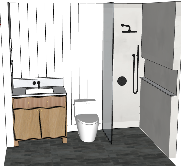 turn this view into a realistic rendering dimensions of bathroom is 98 long 58 wide and has 9 ceilings shower width is 30 wide use products and materials from reference image