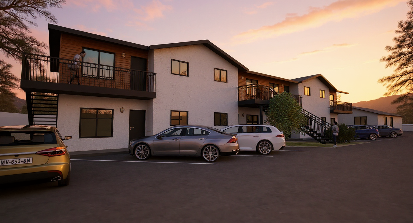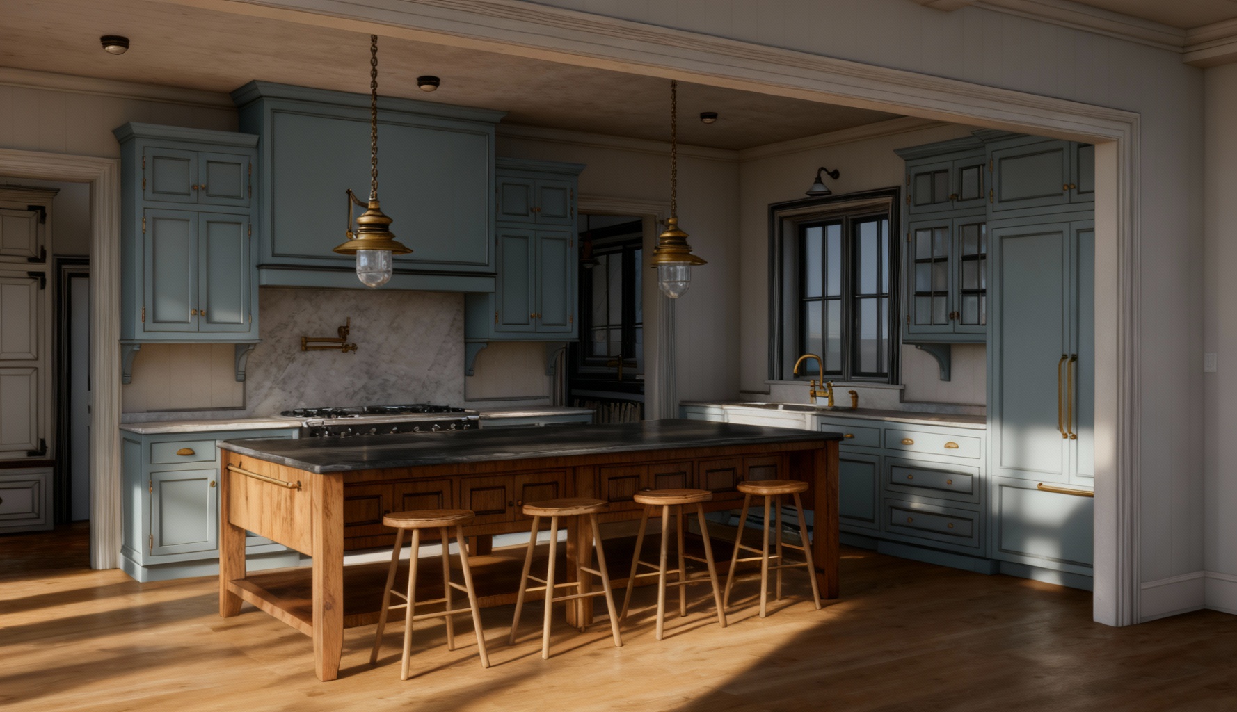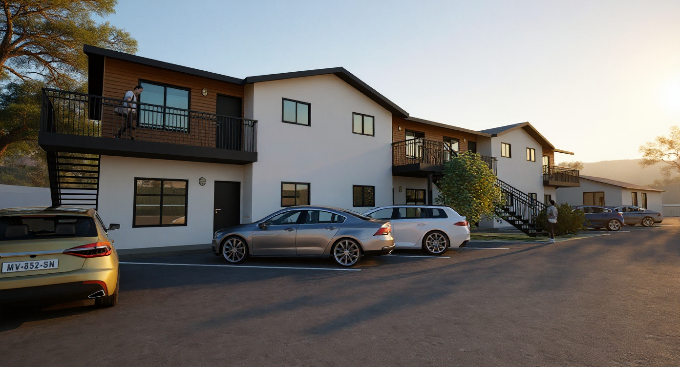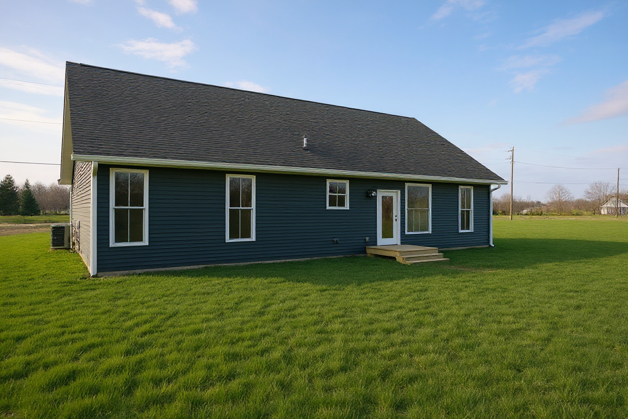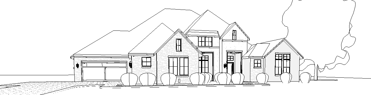 transitional french countryside with austin stone and light stucco black windows and roof landscape with texas native house site sits down slightly from the front view