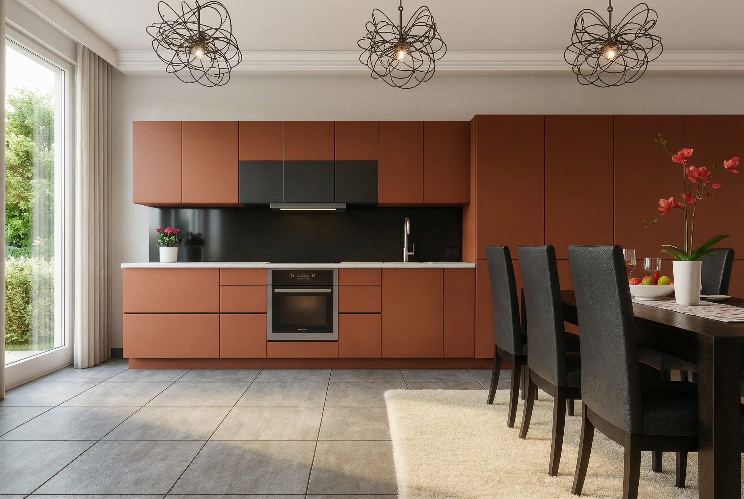 create a modern kitchen and dining area with a warm and inviting atmosphere use burnt orange for the cabinetry and matte black for the backsplash the countertop should be a sleek white adding elegance highlight the intricate black wireframe pendant lights for a touch of sophistication the dining chairs should be upholstered in charcoal black complementing the wooden dining table incorporate lush greenery visible through large windows with sheer light gray curtains allowing natural light to fill the space the flooring should be light gray tiles with a soft beige carpet underneath the dining area for coziness add vibrant red flowers in a white pot on the table for a pop of color and ensure the overall lighting is warm and gentle architecture