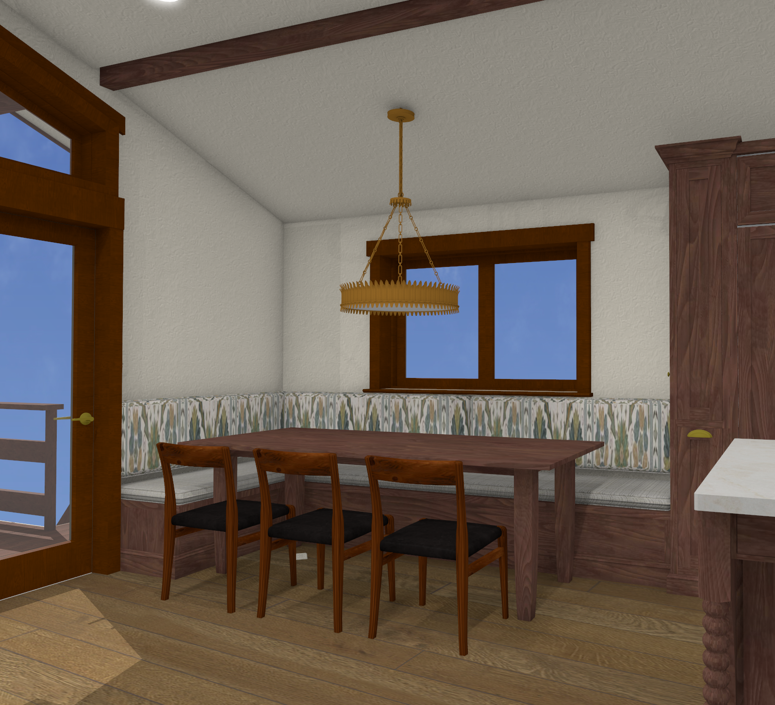 nordic interior shot add a wood end to the left and right side of the banquette in an austrian chalet feel encompassing the seat and the back cushion change the table to a trestle base table in a warm and slightly distressed wood brown leather seat custhion and green patterened back cushion architecture