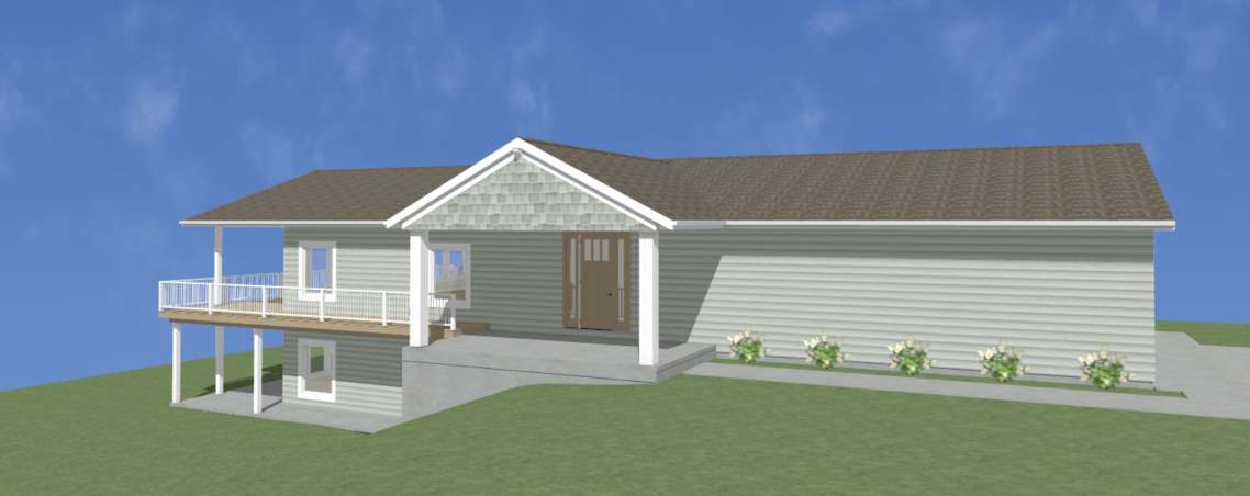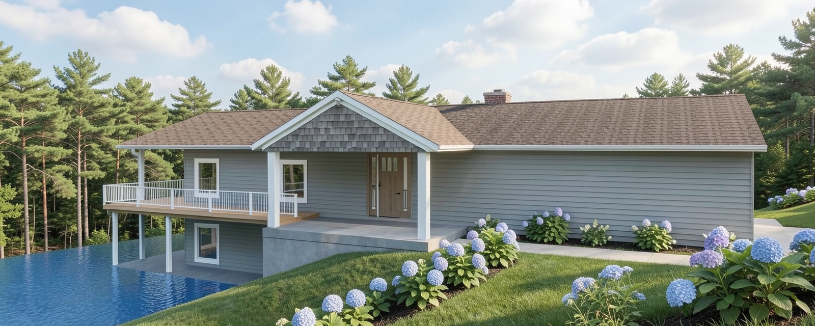 a soft gray cabinet set on a slight downhill slope a big blue lake at the bottom of the hill in the distance pine trees scattered behind the house a manicured lawn with a few white hydrangeas lining the walkway a brown shingle roof a soft blue sky with white clouds that soften the scene a light brown deck above and a concrete pad below a light brown front door