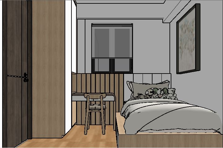 buat gambar ultra realistis tanpa mengubah struktur bentuk desain atau material apa pun jangan mengubah ukuran jpeg plafond warna putih tambah lampu spot light di plafond jangan ubah material warna dan bentuk dan tambahkan indirect light di atas headboard dan tambahkan indirect light di rak