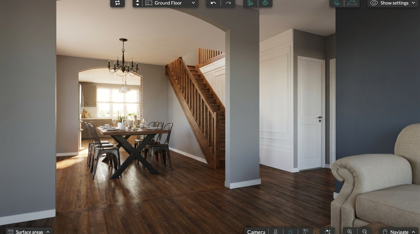 convert this floor plan into a realistic isometric 3d view of a kitchen show the space from an elevated angle with furniture walls and details visible modern farmhouse kitchen white oak cabinets white oak wood floors light marble countertops white subway tile backsplash white farmhouse sink with exposed front apron black framed windows use the same furniture as shows on the plan do not change the orientation of the floorplan