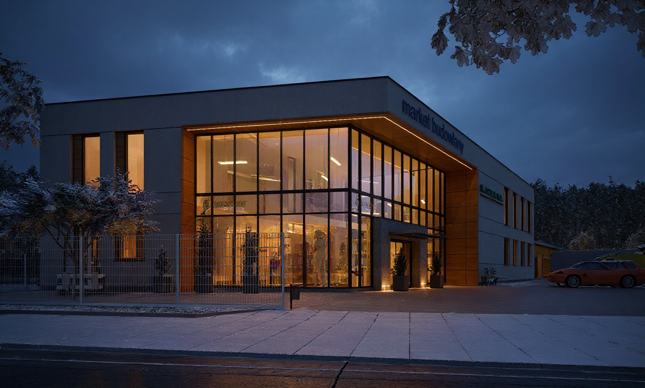 black exposed metal steel work from with red brick work infill gravel parking to the front and close boarded fence to either side no concrete plinth