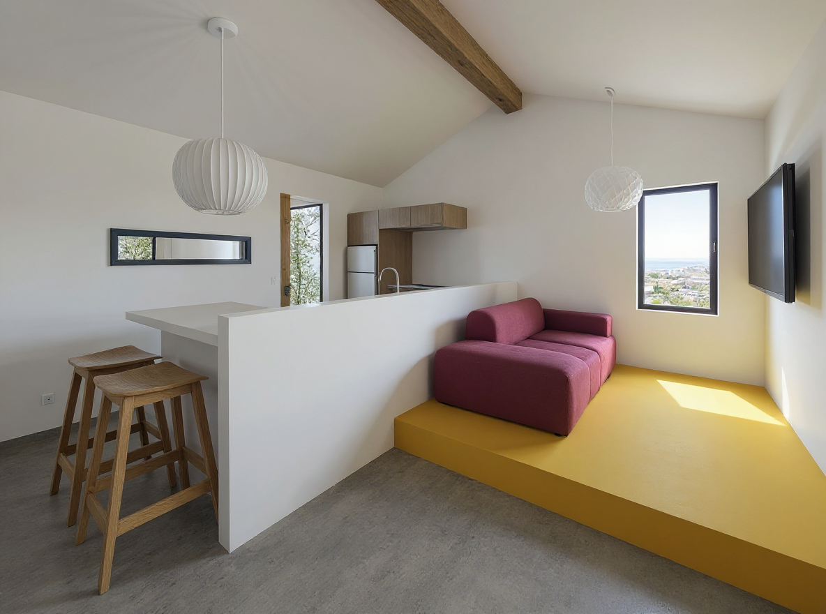 design me a wow factor waterfall edge kitchen island that is a dark natural stone also design a modern contemporary hood vent that is covered with the natural stone and the backsplash is the same natural stone as well