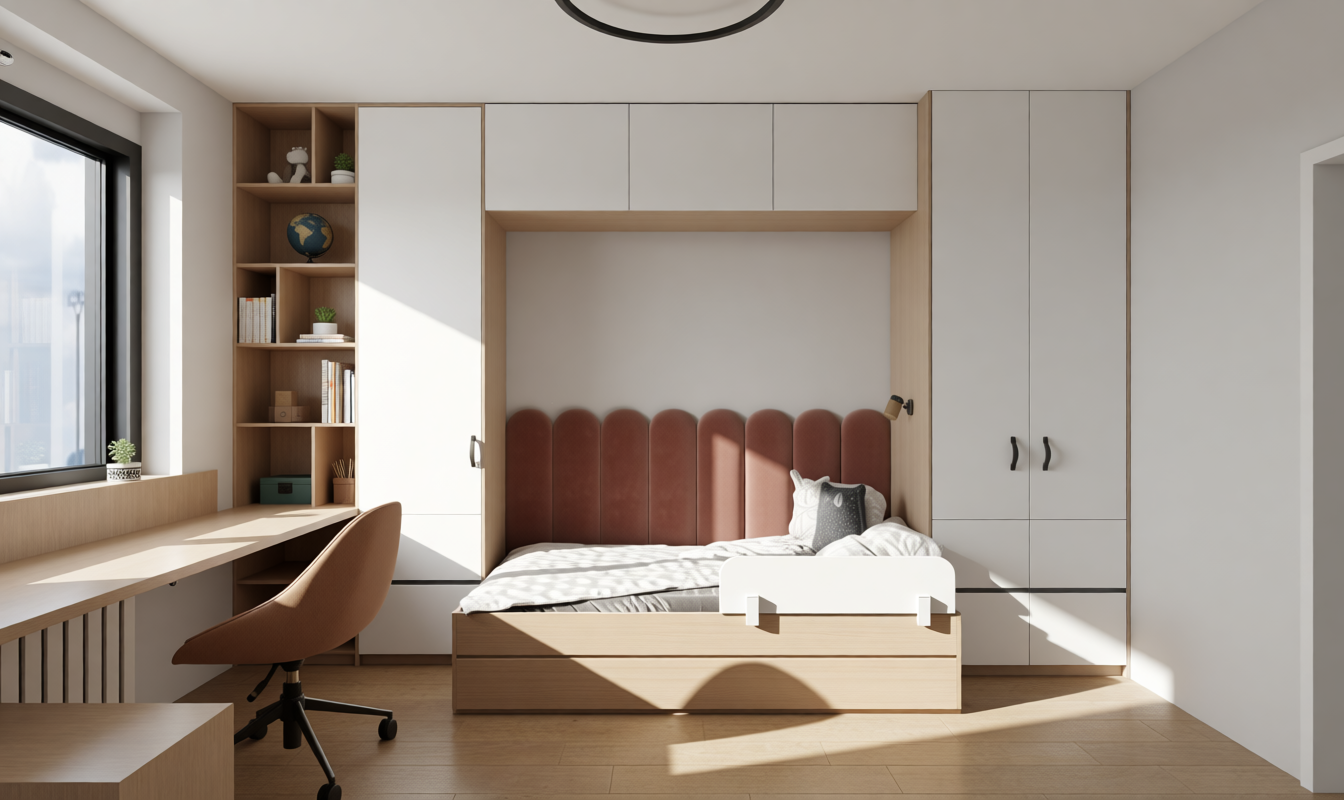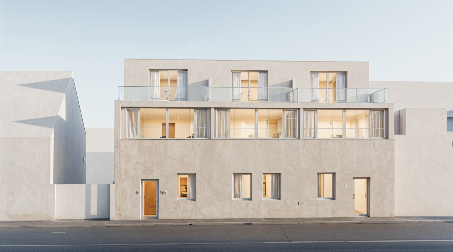 soft light in windows white curtians curtains white railings with white steel mesh in front pavement with grass left and right doors are glass transparent top floor whiet plaster