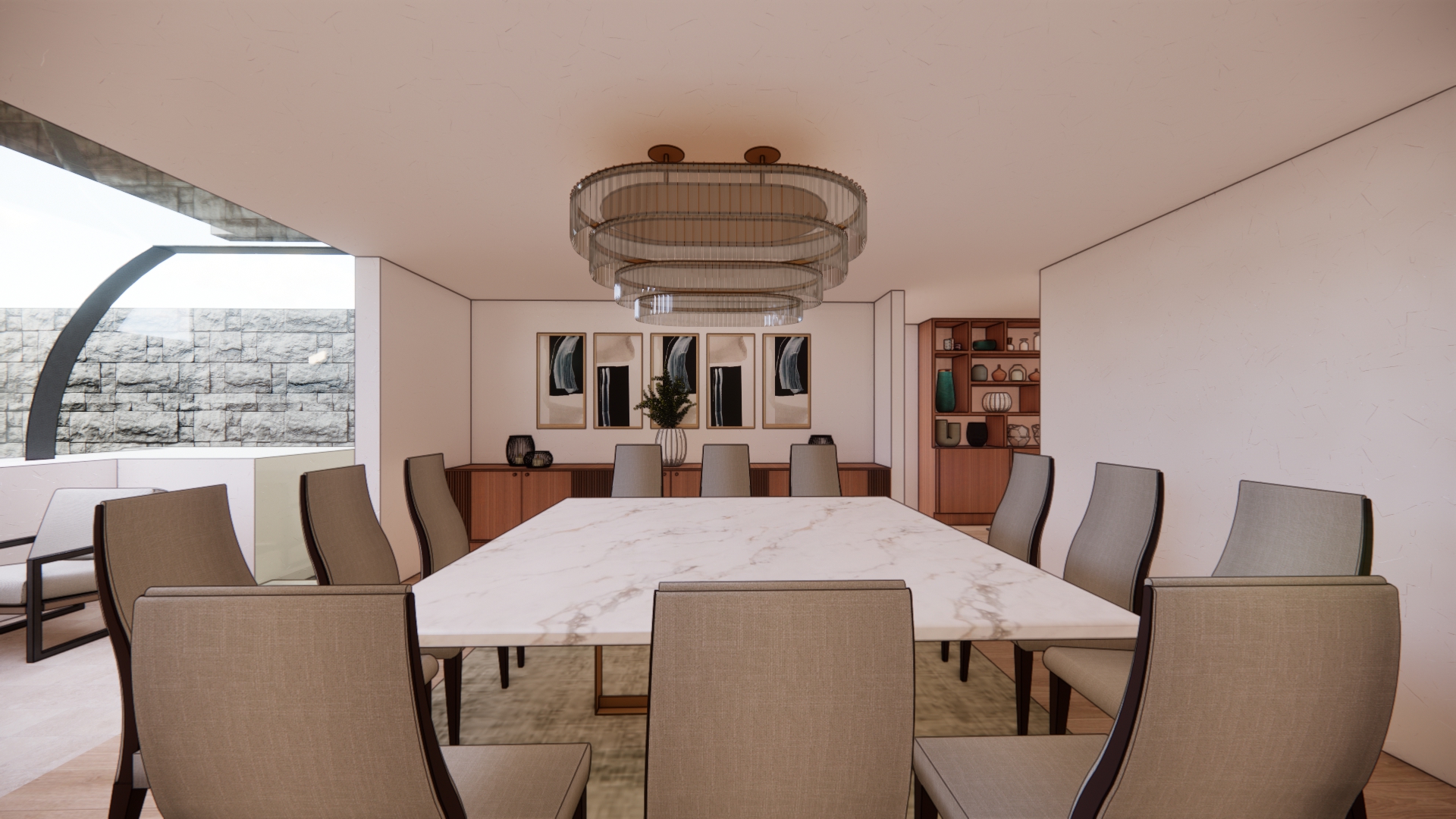 improve this dining room render while keeping the existing furniture layout make the chairs appear soft and comfortable by enhancing their textures improve the overall lighting for a bright and natural atmosphere without adding any new lamps add a modern decorative centerpiece on the table such as a plant or vase and place another decorative plant on the floor to enhance the style of the room make the overall scene more realistic with lifelike materials lighting and shadows