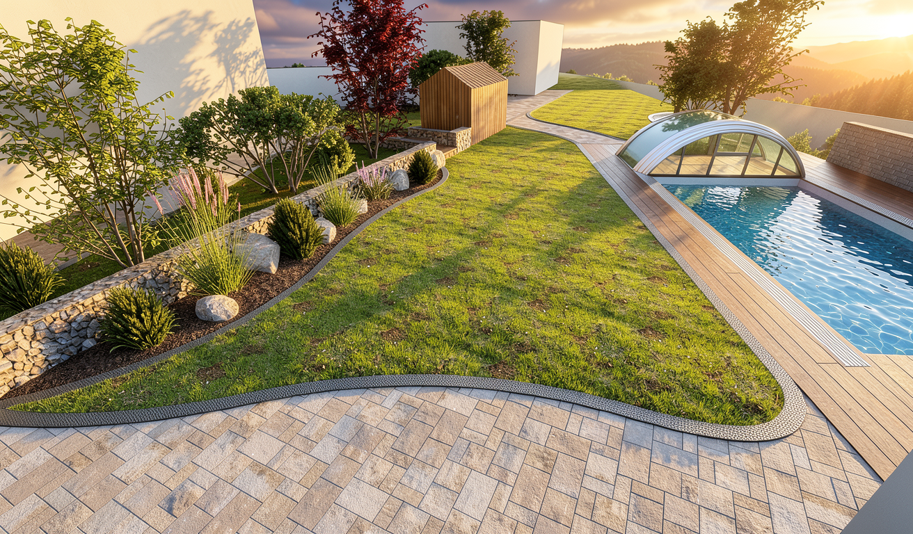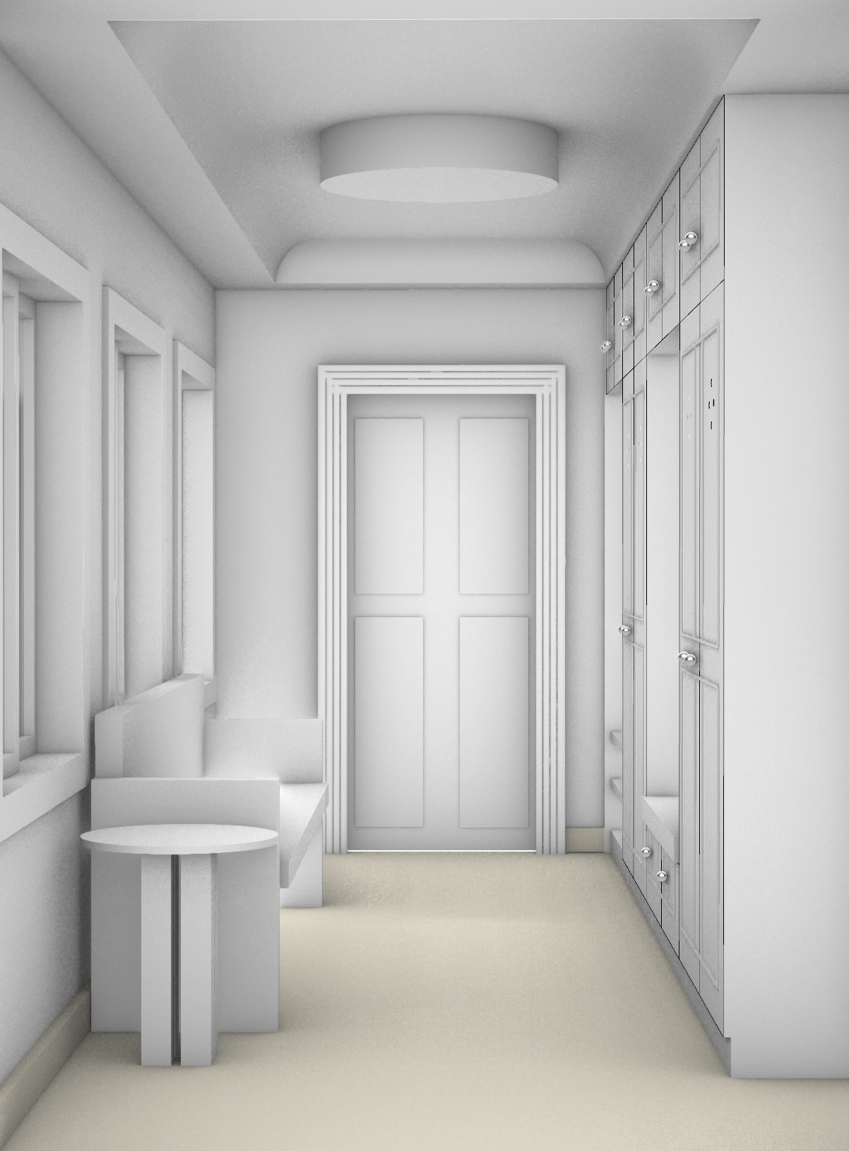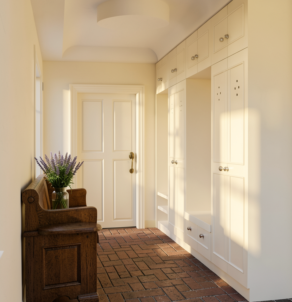 render this with a romantic morning light on it keep all the materials off white cream yellow except the floor can be an outdoor brown red brick tile make the front door on the left a craftsman paneled door but still off white with a bronze handle make the bench on the left a oak antique church pew and add vase of lavender flowers the knobs on the doors should be polished nickle this room is 20 long