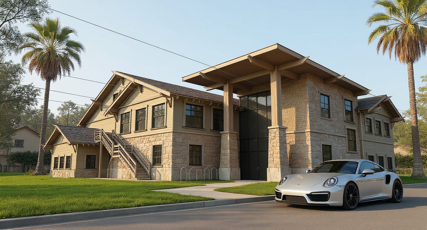 create realistic photo darker brand new clean building with stone and cedar wood siding add california native landscape and trees overcast weather with lights coming out of all windows and glass doors at the main entry add uplighting on the sides of the building remove car