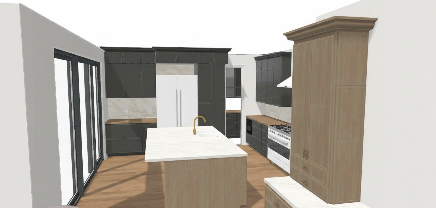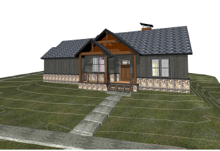 show me this exterior with black shingles beam work a chocolate semi clear stain window trim black and green siding solid dakota shadow from benamin moore in 1x6 everwhere it is currently green stone will be gabian stone baskets there is also the rusty metal siding as shown but get rid of that gabian stone retaining will be at sidewalk and then grading will be flush with concrete porch