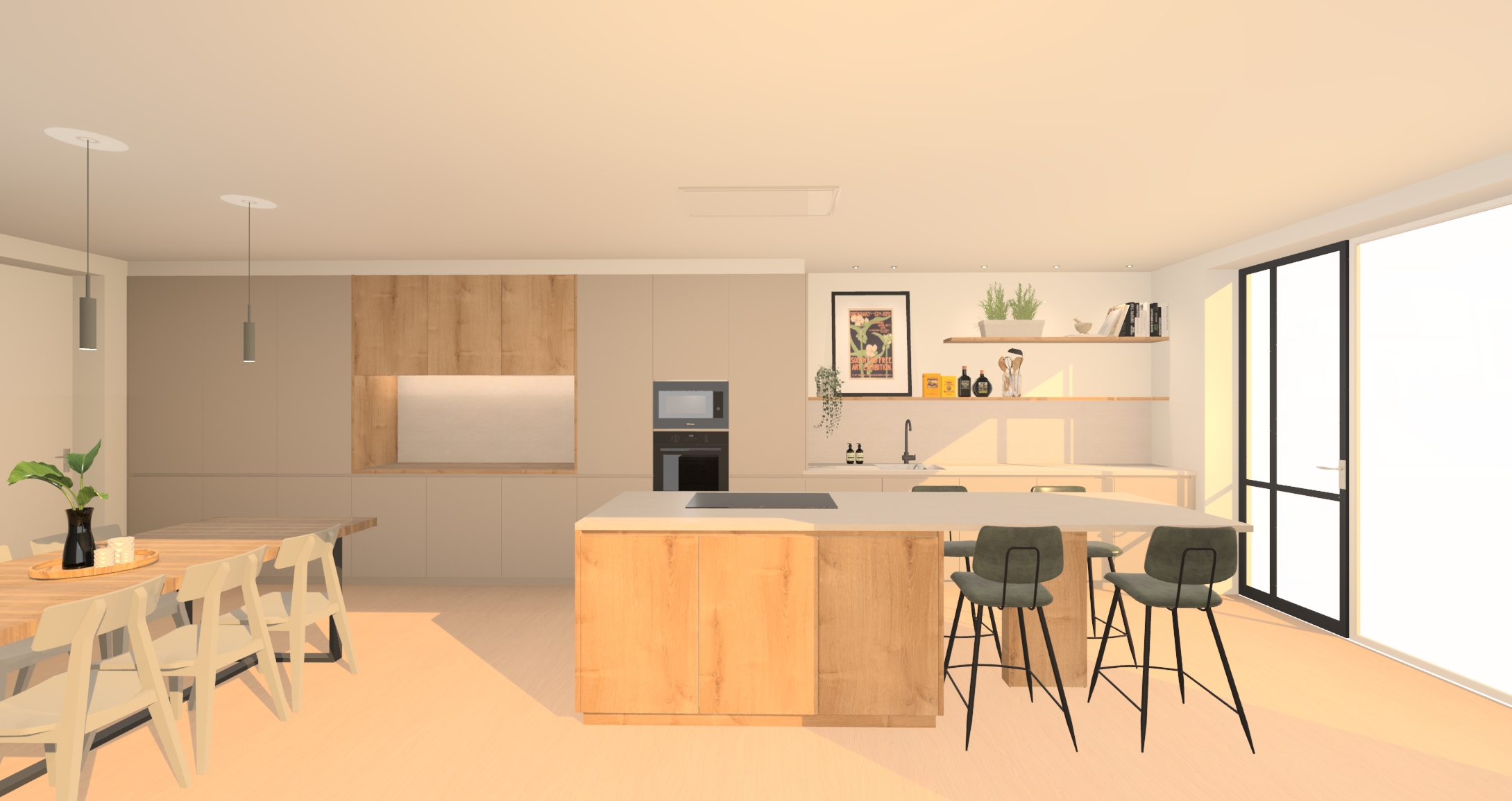 enhance this photo of a kitchen into a professional interior image optimize the lighting so the space appears bright natural and inviting with soft realistic light entry and balanced shadows subtly increase sharpness and clarity correct white balance and colors so that materials such as wood stone metal and lacquer appear true to life and luxurious ensure the overall look is sleek stylish and high end without changing the layout furniture or architecture maintain a realistic appearance refine contrast and details reduce noise and give the photo a warm elegant interior style like in a premium kitchen catalog