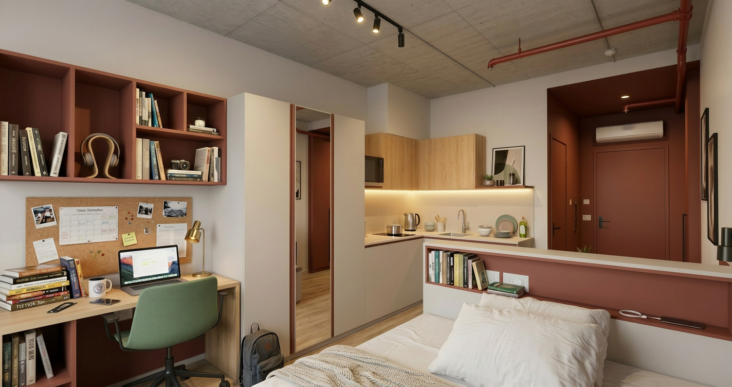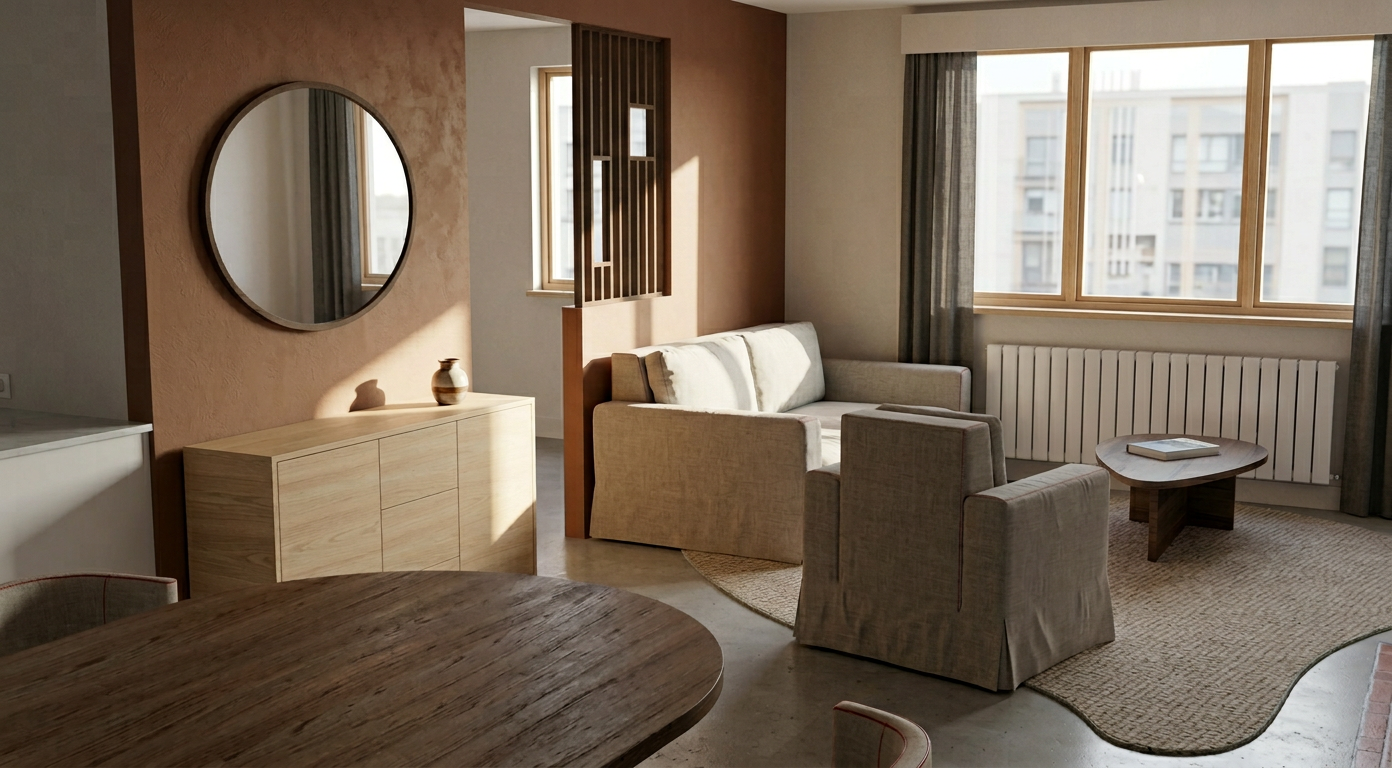 a modern apartment building with four stories characterized by a sleek design and contemporary architecture the building features white walls with soft beige accents large black framed windows and black railings on the balconies create a bright and clear blue morning sky to enhance the fresh and clean atmosphere the ground is paved with textured gray cobblestones contrasting with lush green grass add parked cars in red white and blue contributing to a lively and inviting environment emphasize a sense of tranquility and modern urban living add a smooth concrete driveway on both sides of the nuilding create ultra realistic lighting crisp shadows detailed textures in the wood siding and glass reflections and a vibrant clear sky with light atmospheric depth render in hyper realistic architectural visualization quality 8k resolution add wood under the balcony similar to the facade take the wood of the facade off and replace it with paint in beige color