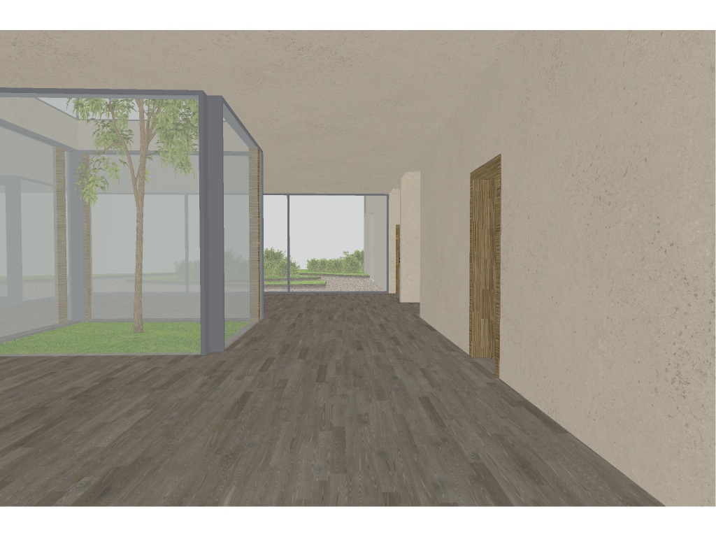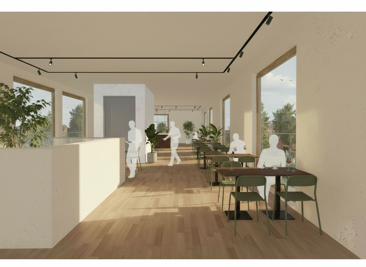 floor wooden planks light oak interior walls and ceiling interior plaster with wall paint skimming stone black light tracks modern warm gold lightning dark brown wooden tables oliv green metal chairs with big houseplants on the floor with semi transparent walking people inside and people sit at tables and drink wine a waiter with a white waiter s jacket goes to the guest with a tablet style scandinavian minimalism clean geometry high realism soft warm lighting color oft he lightning warm yellow beige camera eye level perspective wide angle sundowner with soft shadows few clouds in the sky birds flying can be seen through the windows from the first floor is the city of b dingen small town with trees