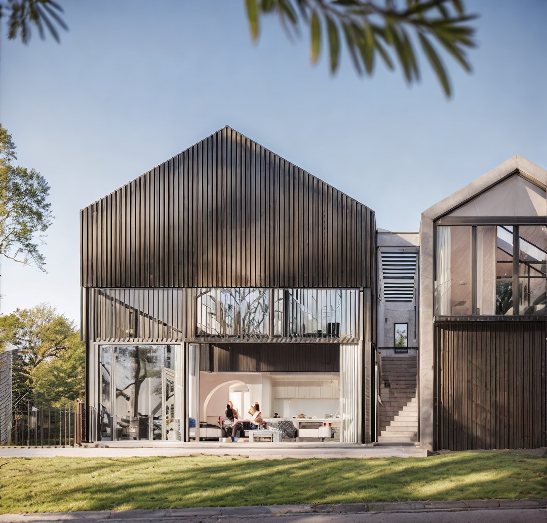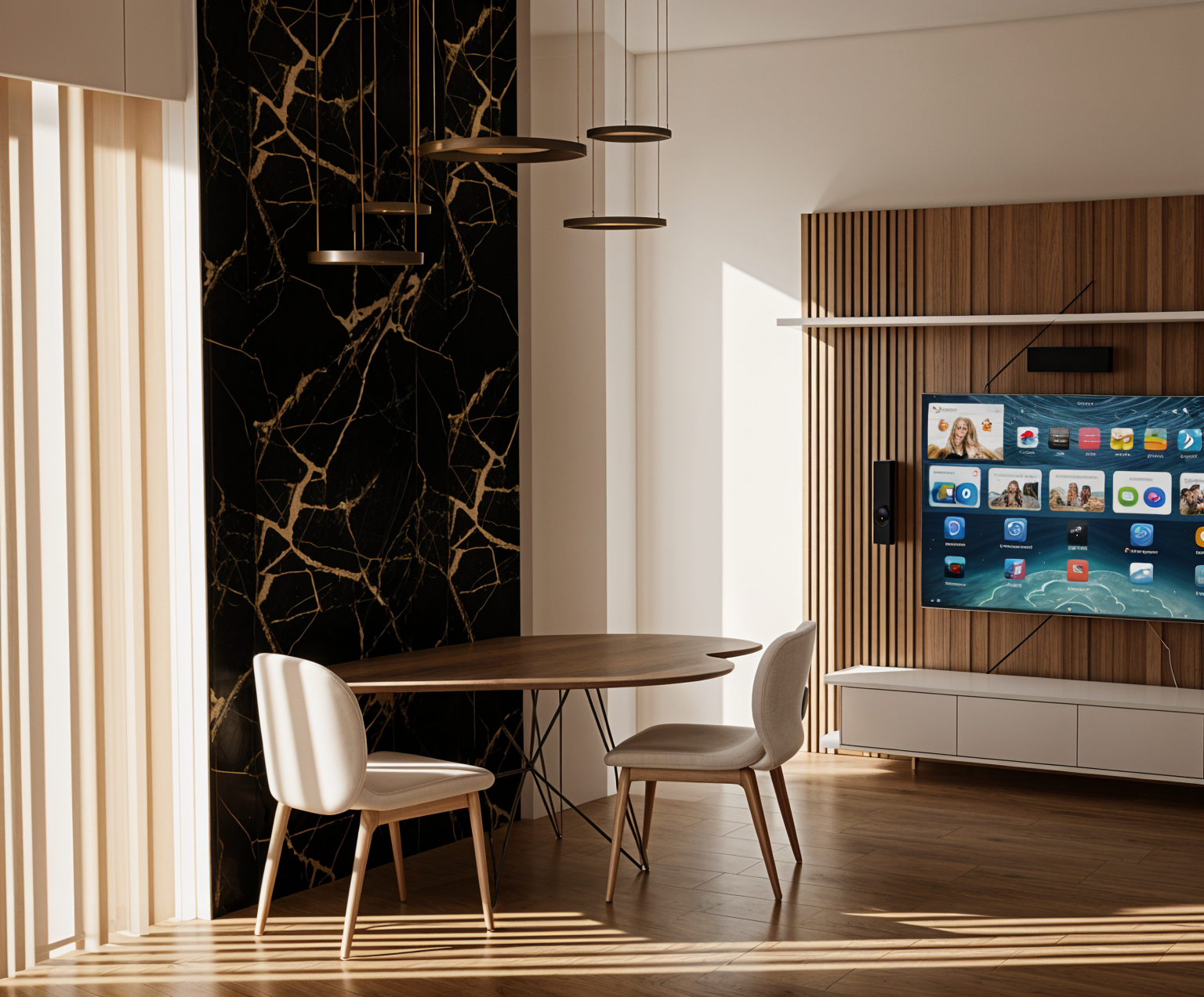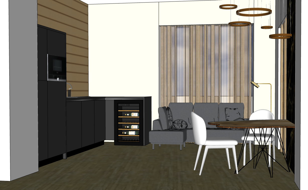 contemporary interior shot lunch table wooden floor grey modern sofa lush light fitting bright room black kitchen architecture