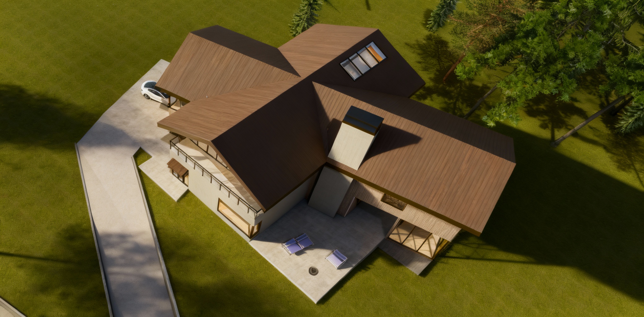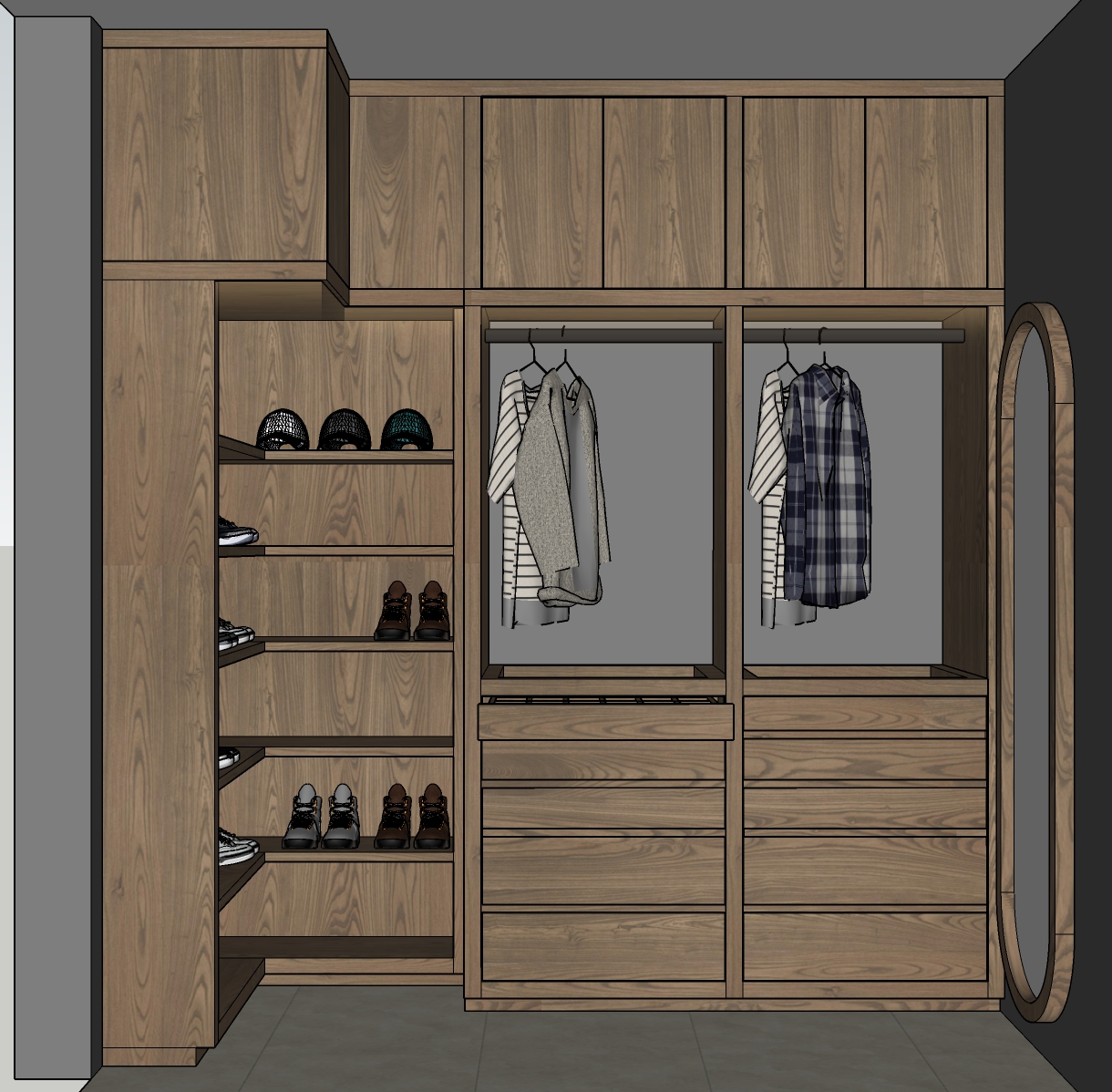 convert this screenshot into a hyper realistic architectural rendering keep the exact proportions layout and furniture design this is a custom built in wooden closet with natural walnut finish and subtle vertical grain maintain the same wood tones textures and matte surface the open shelving on the left contains shoes and caps exactly as shown the central modules include hanging clothes with realistic fabric textures and natural folds the drawers should match the existing wood and proportions the tall vertical element on the right is an oval wooden mirror keep its shape frame thickness and placement add soft indirect led lighting underneath the upper luggage cabinets creating a warm glow over the closet modules maintain the same color palette the gray wall behind the closet and the floor tile color render with photorealistic lighting soft shadows high resolution materials and a clean editorial style