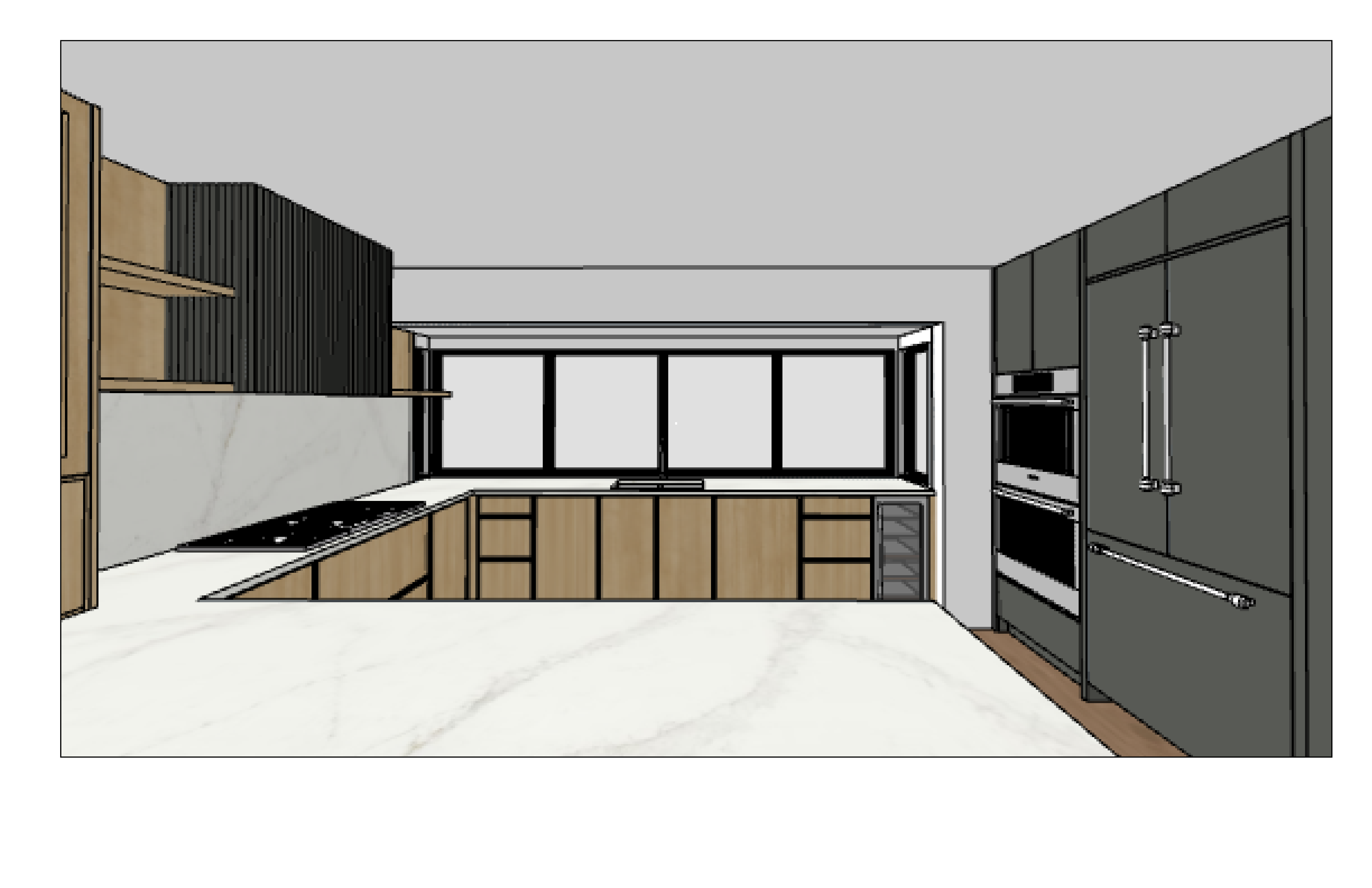 stage the kitchen as well with black cabinet pulls the hood fan is going to be finished in ribbed panels glass for the glass cabinet is ribbed glass but maintain the wood grain shaker as shown on the photo the gray cabinets will all have flat slab doors no thin shaker like the wood grain cabinets have a view of the garden visible from the window the windows are 4 windows with black frame