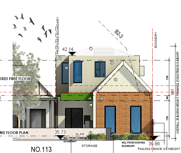 every material has a number denoted to it 1 is heritage brick wall 2 is james hardy axon timber look cladding 3 is mid brunswick green 4 is selected concrete fair bianca white 5 is alucobond cladding 6 is timber cladding lining 7 is surfmist colorbond corrugated rood cladding
