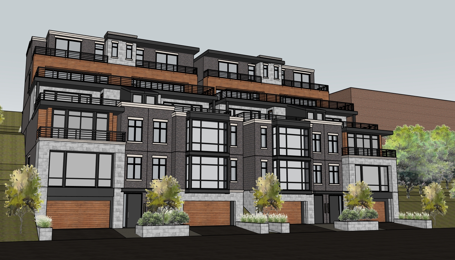 ultra photorealistic architectural rendering in a cinematic real time visualization style unreal engine d5 render quality late morning daylight with slightly angled sun creating soft defined shadows balanced exposure with no blown highlights low bloom and controlled dynamic range warm neutral color grading with subtle warm highlights and neutral shadows no blue tint natural material response with warm light reflecting off wood and ground surfaces slight contrast boost with clean crisp edges and subtle ambient occlusion clear atmosphere with no fog or haze but natural depth created through slight background softening and contrast falloff foreground and main subject remain sharp and detailed minimal curated landscaping with natural but slightly desaturated greenery no overgrown vegetation cinematic composition realistic sky with soft blue tones and light clouds professional architectural visualization style sharp focus 8k resolution lit and fully furnished interiors behind windows road with driveways to garages in foreground building built into hill front of building looking up at building on small hill with hillside historic mt adams city of cincinnati ohio in background and trees