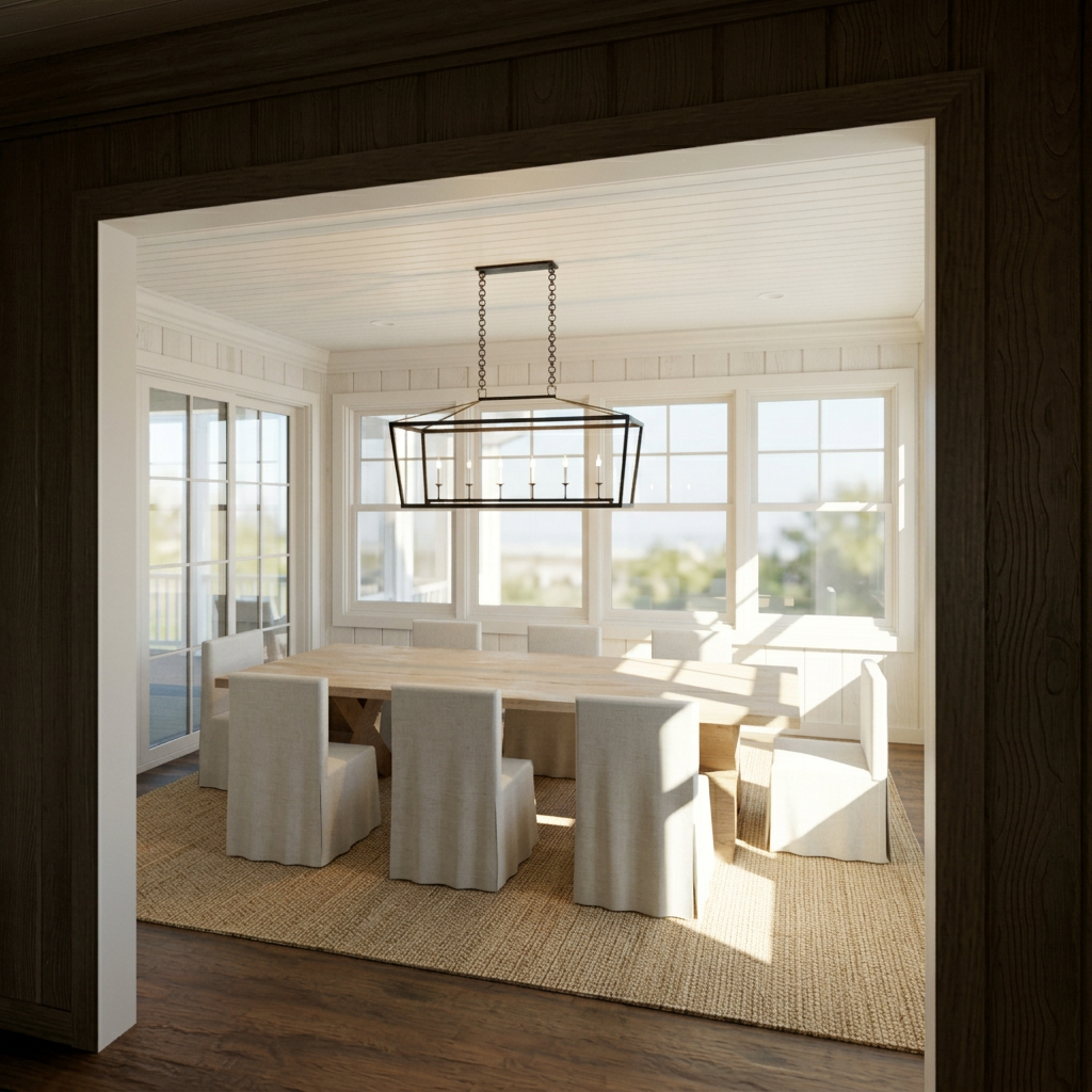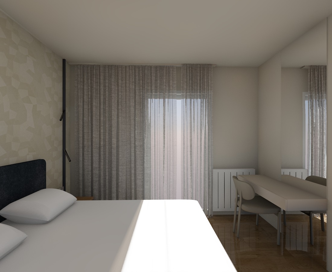 chair in front of the vanity curved design chair upholstered in soft off white boucl fabric with visible micro texture matte black metal frame and slim black legs elegant contrast between textured fabric and dark structure floor warm natural wood flooring with soft reflections lighting mood calm soft daylight refined minimal luxury camera eye level realistic materials high detail soft global illumination fabric micro texture visible brushed black metal finish subtle reflections on mirror