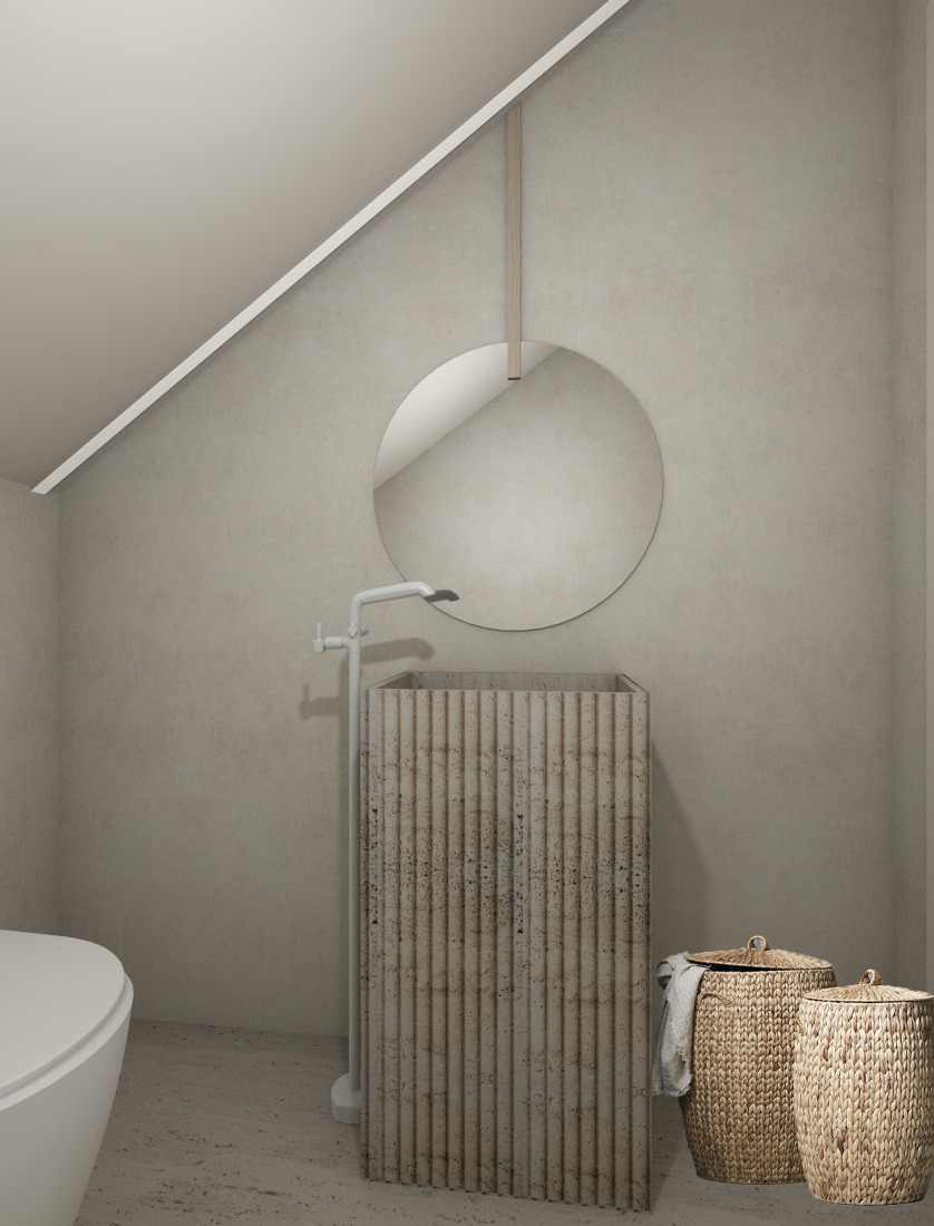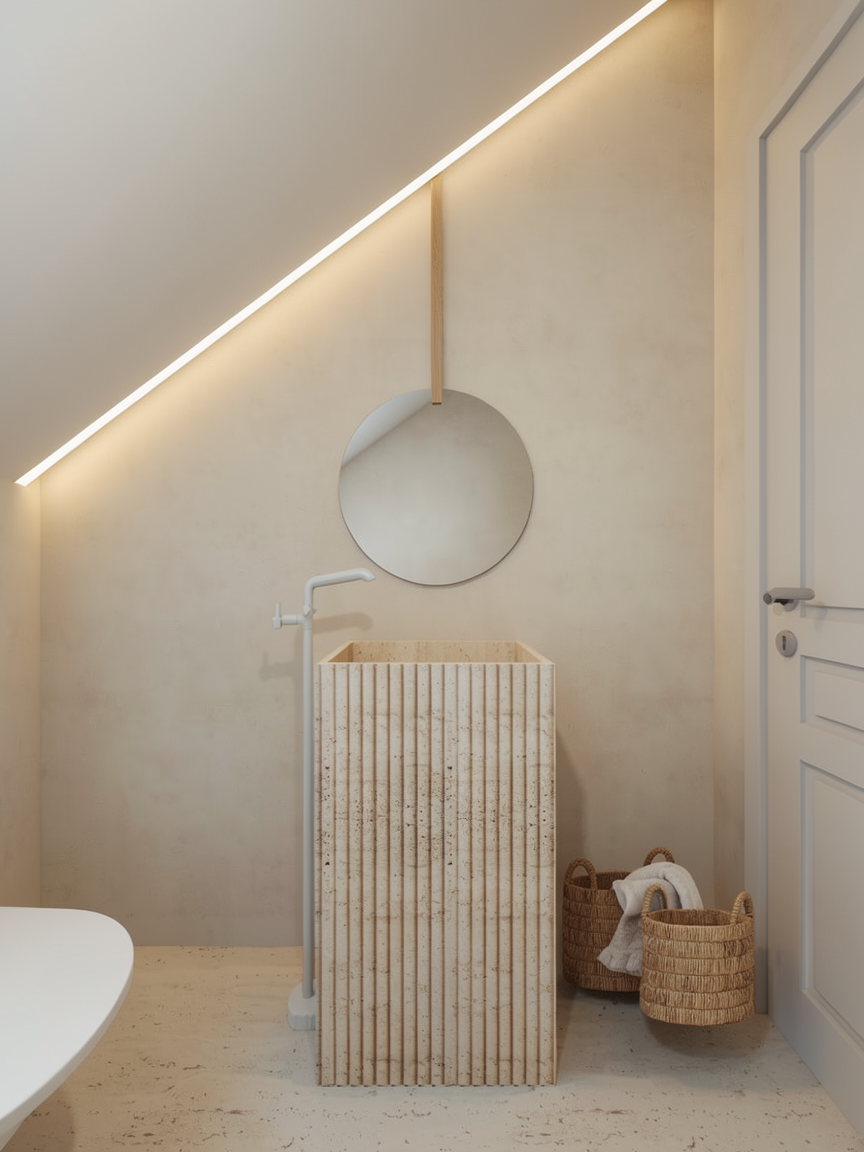 the space is illuminated exclusively by a linear light fixture integrated into the sloped ceiling the fixture has a slim 3 cm profile and provides soft even lighting that gently fills the space it is the only light source in the room the sink is made of travertine marble with a front surface featuring subtle linear grooves adding texture and depth the wall is finished in a light beige microcement there is a circular mirror slightly larger in scale enhancing the sense of space above it a thin vertical wooden slat extends from the top of the mirror up to the ceiling adding a subtle architectural detail on the right side there are woven straw baskets placed directly on the floor the overall atmosphere is calm minimal and refined with natural materials and a clean architectural aesthetic