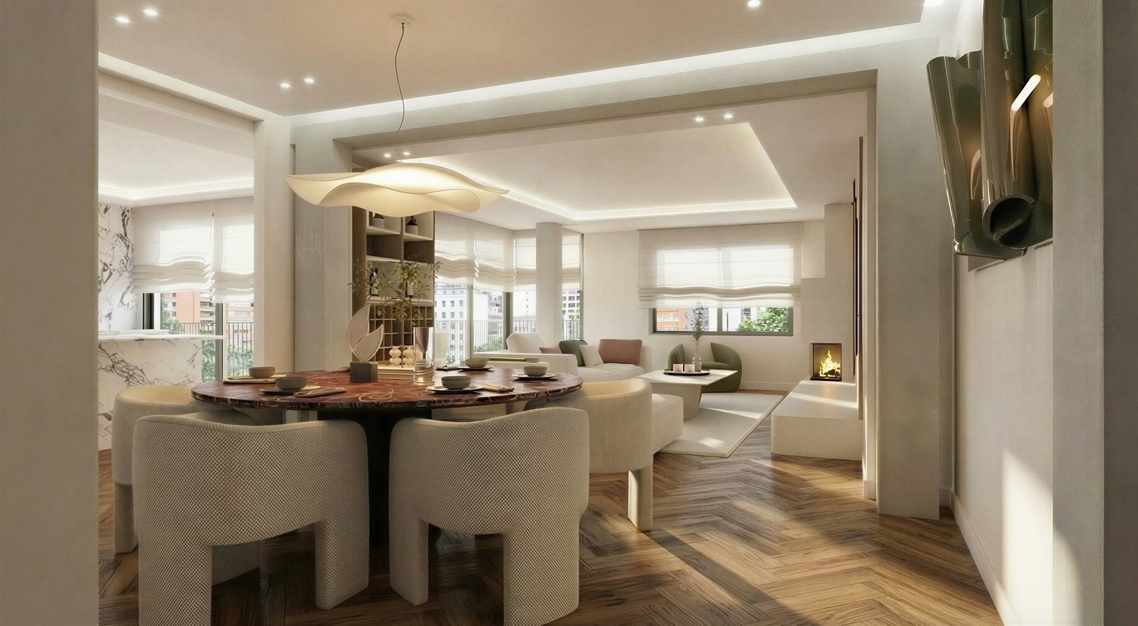 necesito mejroar esta imagen primero el tono de la imagen es demasiado amarillento hay que regular el balance de amarillo por otro lado la chimenea es un caset integrado en un modulo de pladur que debe ser en color grafito oscuro casi negro la parte baja que se aprecia en la imagen como microcemento y que continua por debajo de la tv tambien debe ser efecto lacado mate negro pero el panel trasero de la tv sigue siendo madera en esta imagen tambien se ve la zona de comedor que en prncipiono debes hacer nada con ello has modificado unas columnas y vigas en el techo que son estructura de la vivienda y que son en cemento gris el suelo tambien lo has oscurecido manten el tono inicial mas claro ojo es solo la viga el resto del techo es blanco las sillas son boucle blanco