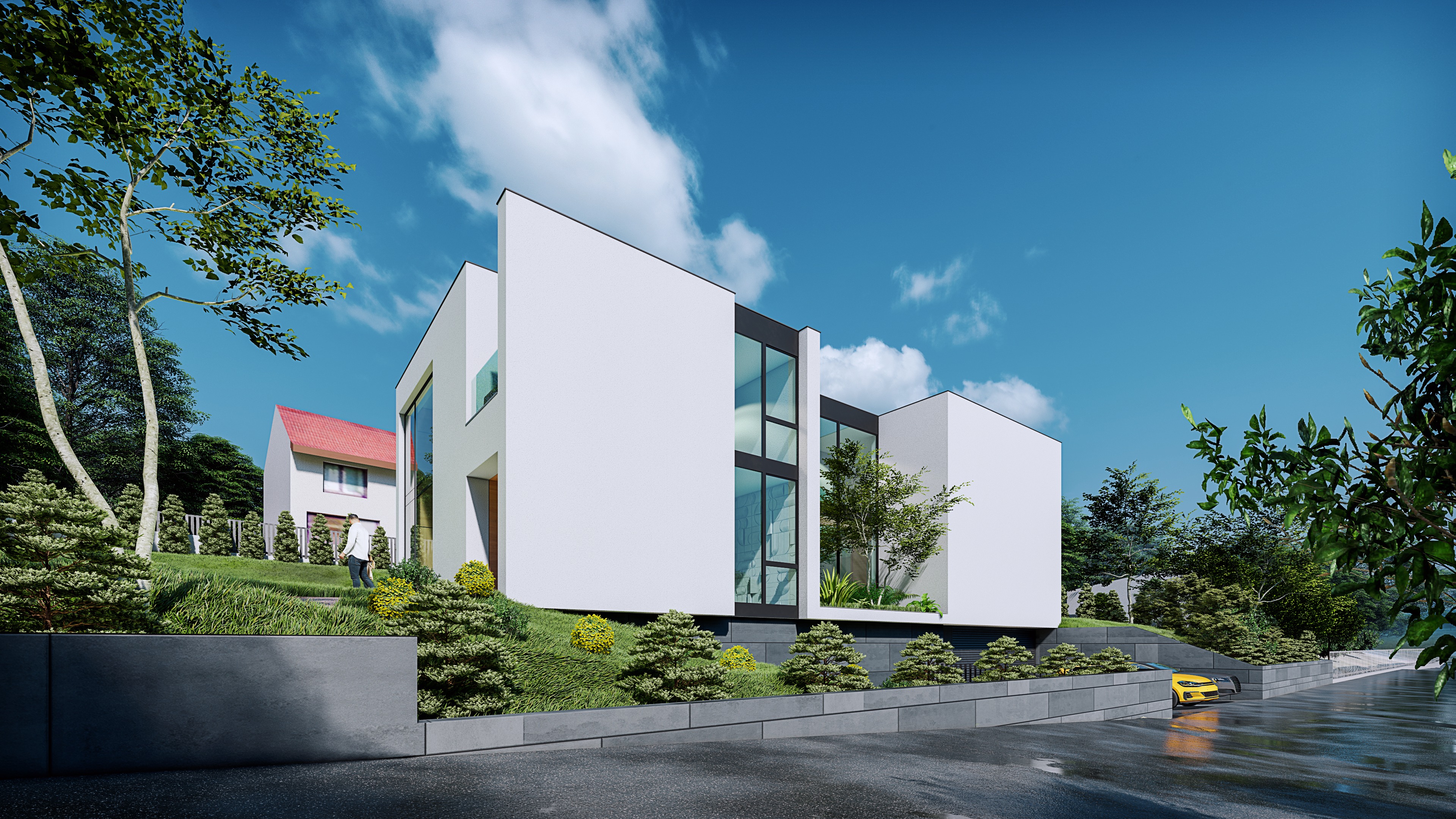 important preserve the existing geometry and the existing context exactly as provided do not modify alter reinterpret add remove scale or reshape any geometry do not change the site surroundings street layout neighboring buildings vegetation or context elements do not modify geometry scale proportions buildings road layout sidewalks or surrounding context in any way do not change text photorealistic architectural rendering clean and balanced contrast calm cinematic mood style contemporary european residential architecture minimalist premium understated include people seating and standing inside do not alter the church color soft overcast evening atmosphere diffused cold natural daylight with subtle blue grey tones cinematic architectural mood warm interior lighting 3000k glowing from inside creating strong contrast between cool exterior and warm interior large glass surfaces with realistic reflections soft mirror effect subtle environmental reflections of sky and surroundings gentle fog diffusion in background wet pavement with smooth reflective surface soft light bounce and blurred reflections high dynamic range lighting realistic global illumination soft shadows calm and minimalist nordic mood photorealistic architectural visualization balanced exposure no harsh highlights