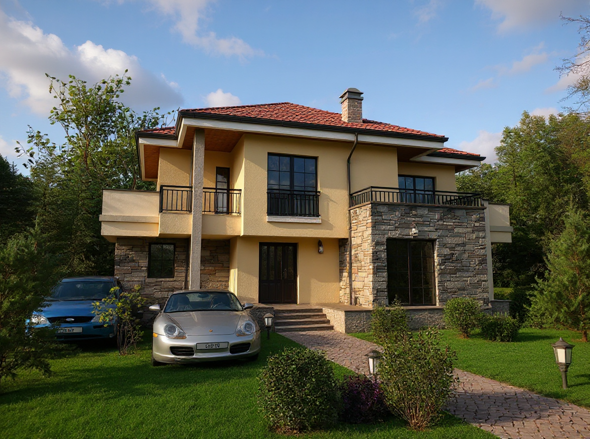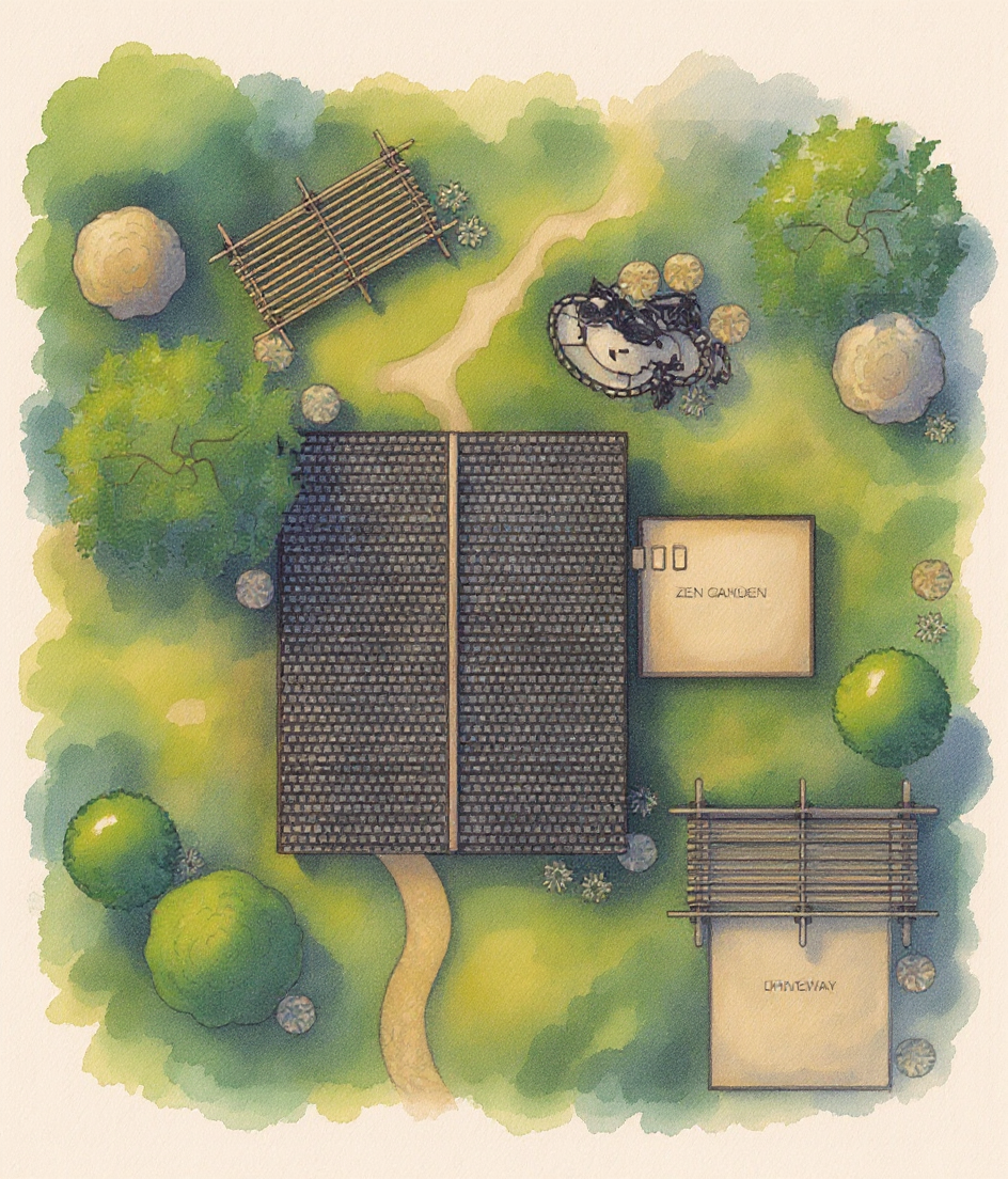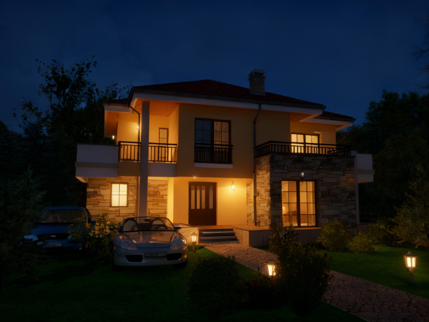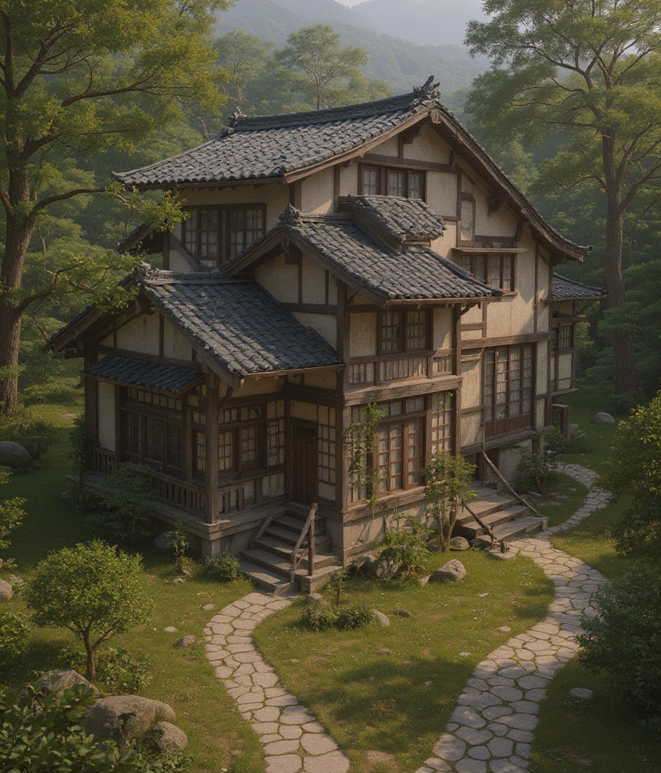 render a cozy attic interior with a warm inviting atmosphere highlight the natural wooden beams and ceiling with rich oak tones the stone wall should have a textured look with varying shades of gray and brown include large black framed windows showcasing a tranquil pine forest with muted greens and blues the wooden flooring should be a lighter shade like polished pine ensure soft ambient lighting to enhance the earthy colors adding a touch of warmth and comfort to the space