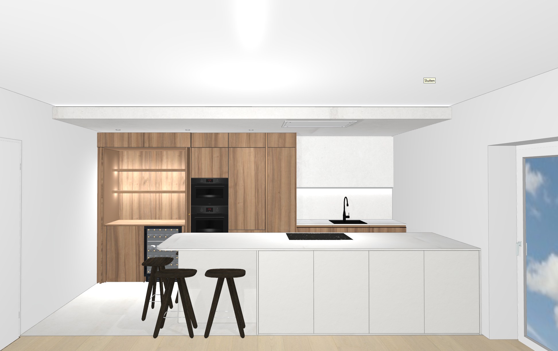 modern japandi style kitchen with beautiful wallnut veneered cabinets and warm offwhite lacquered cabinets for the island add some wine related decor on the shelves in the tall unit add the leds like shown add some general decor