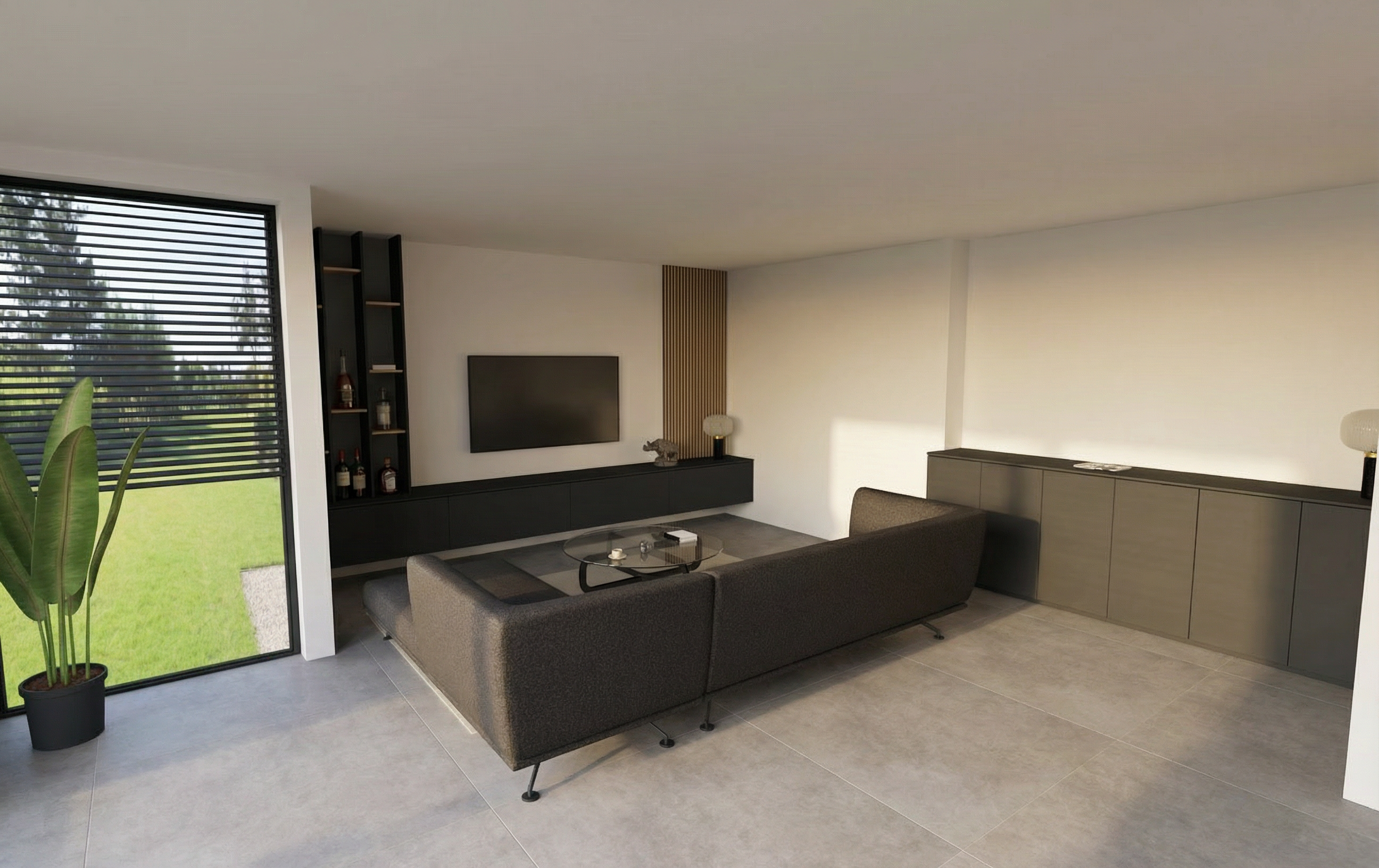 realistic photographic model of a home in a wooded lot with modern landscaping