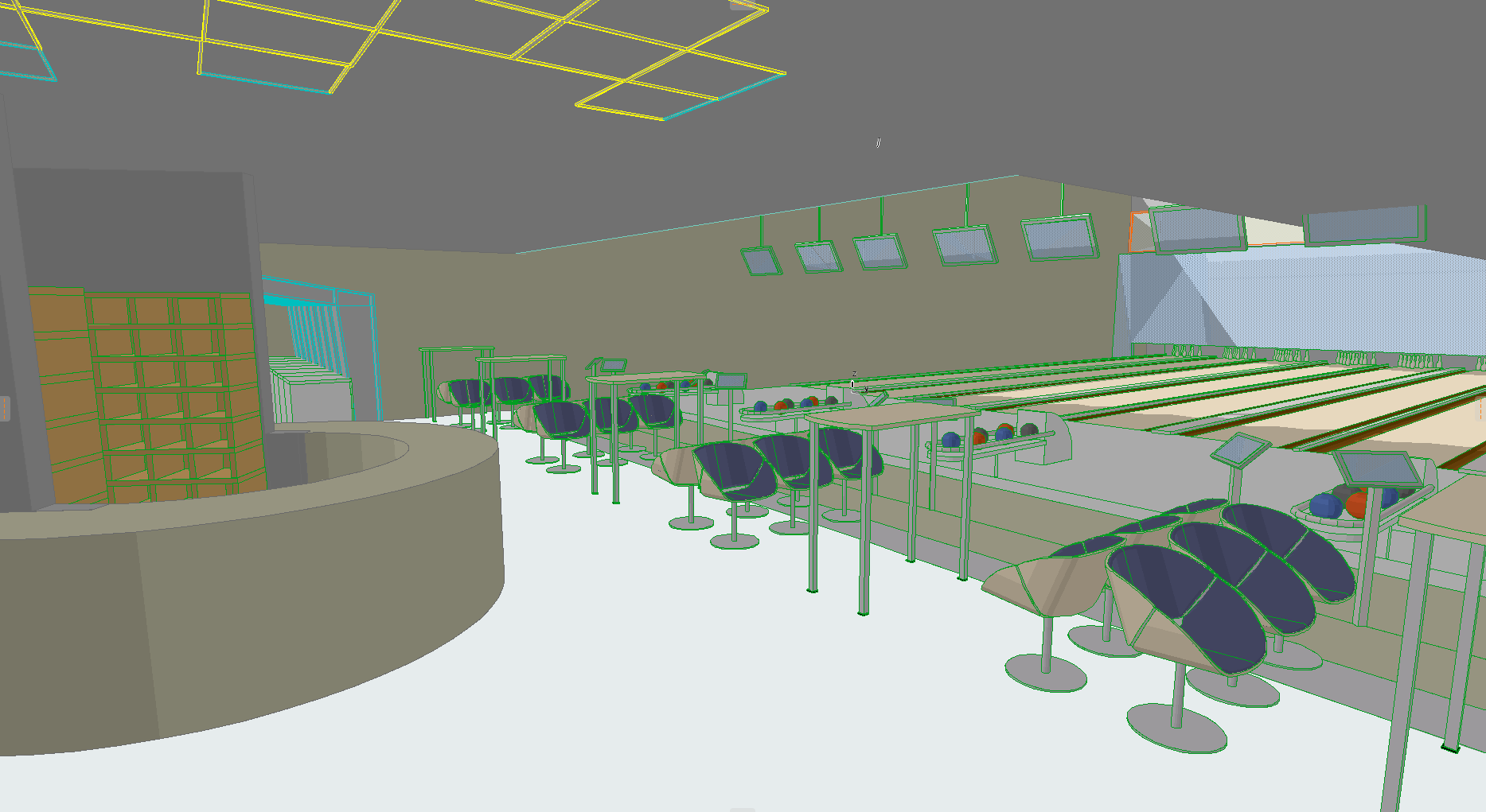 sustainable design interior shot gaming center with bowling and arcade games people having fun night perspective with white led light wood floor black roof and grey walls with light curve lines in white led main door in glass big led ecran in the wall architecture