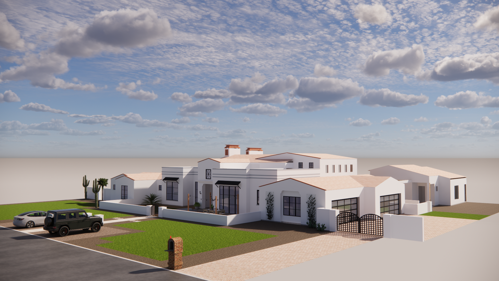 this home is in phoenix arizona render as a photo quality image with partly cloudy skies at 3 pm add some vegetation around the green lawn in the gravel perimeter